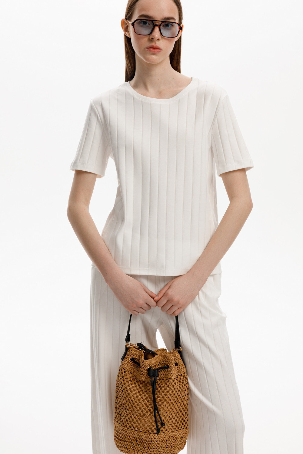 Базовая футболка из 100% гребенного хлопка. Необычное переплетение в виде широких полос придает изделию оригинальность, добавляя фактуры и динамики в образ. В сочетании с брюками из этой коллекции, вы создадите стильный образ для летних дней.