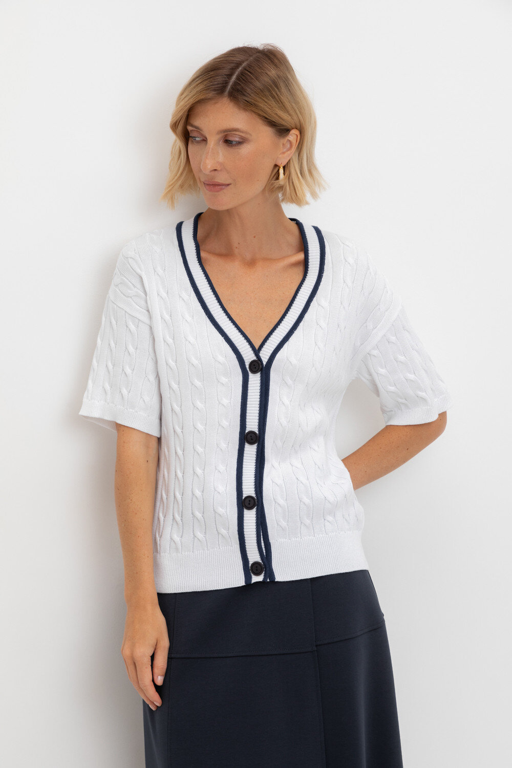 Итальянская хлопковая пряжа белого цвета стала основой для мягкого кардигана. Переплетение в стиле кос, контрастная отделка планки и цвет пуговиц придают изделию классический вид. Хлопок в составе сохраняет форму и дарит ощущение комфорта во время носки.