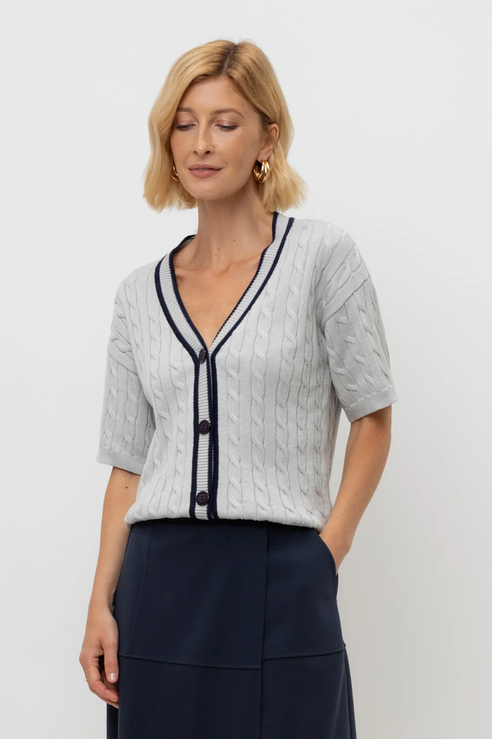 Итальянская хлопковая пряжа жемчужно-серого цвета стала основой для мягкого кардигана. Переплетение в стиле кос, контрастная отделка планки и цвет пуговиц придают изделию классический вид. Хлопок в составе сохраняет форму и дарит ощущение комфорта во время носки.