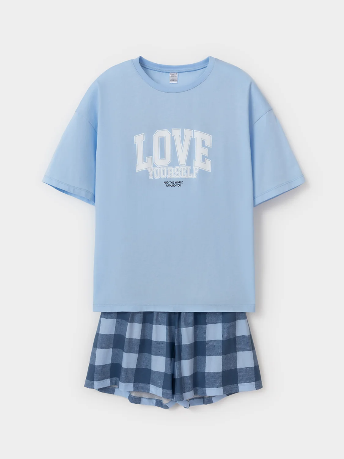 Комплект для комфортного сна и отдыха из трикотажного полотна с набивным рисунком и принтом. Футболка с короткими спущенными рукавами и шорты с мягкой эластичной резинкой в поясе, которые удобно садятся по фигуре. Гладкий материал приятен к телу, не теряет форму и позволяет коже дышать.