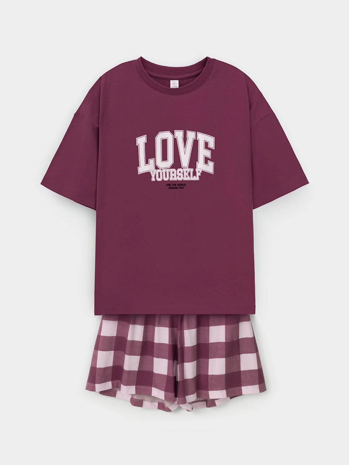 Комплект для комфортного сна и отдыха из трикотажного полотна с набивным рисунком и принтом. Футболка с короткими спущенными рукавами и шорты с мягкой эластичной резинкой в поясе, которые удобно садятся по фигуре. Гладкий материал приятен к телу, не теряет форму и позволяет коже дышать.