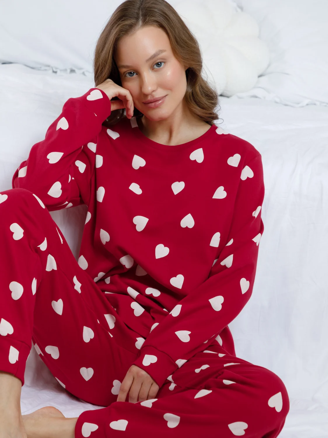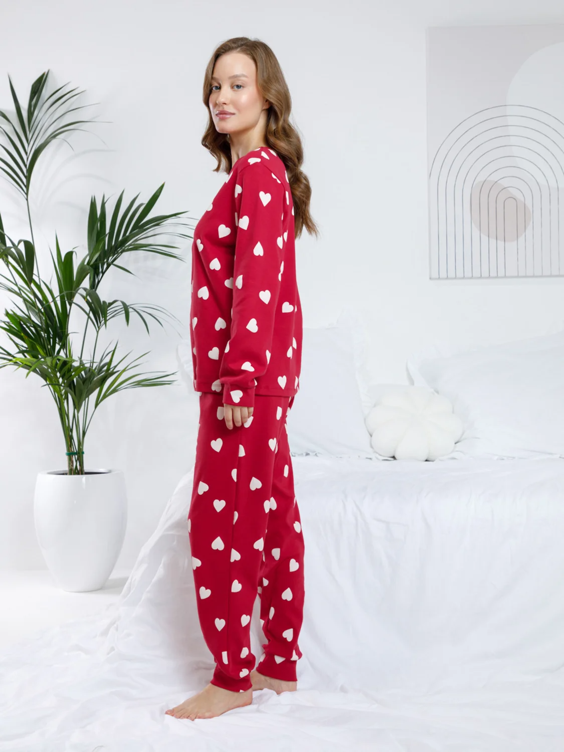 Комплект для комфортного сна и отдыха из трикотажного полотна с набивным рисунком. Джемпер с длинными втачными рукавами и брюки с мягкой эластичной резинкой в поясе, которые удобно садятся по фигуре. Гладкий материал приятен к телу, не теряет форму и позволяет коже дышать. На рукавах и по низу брюк мягкие манжеты.