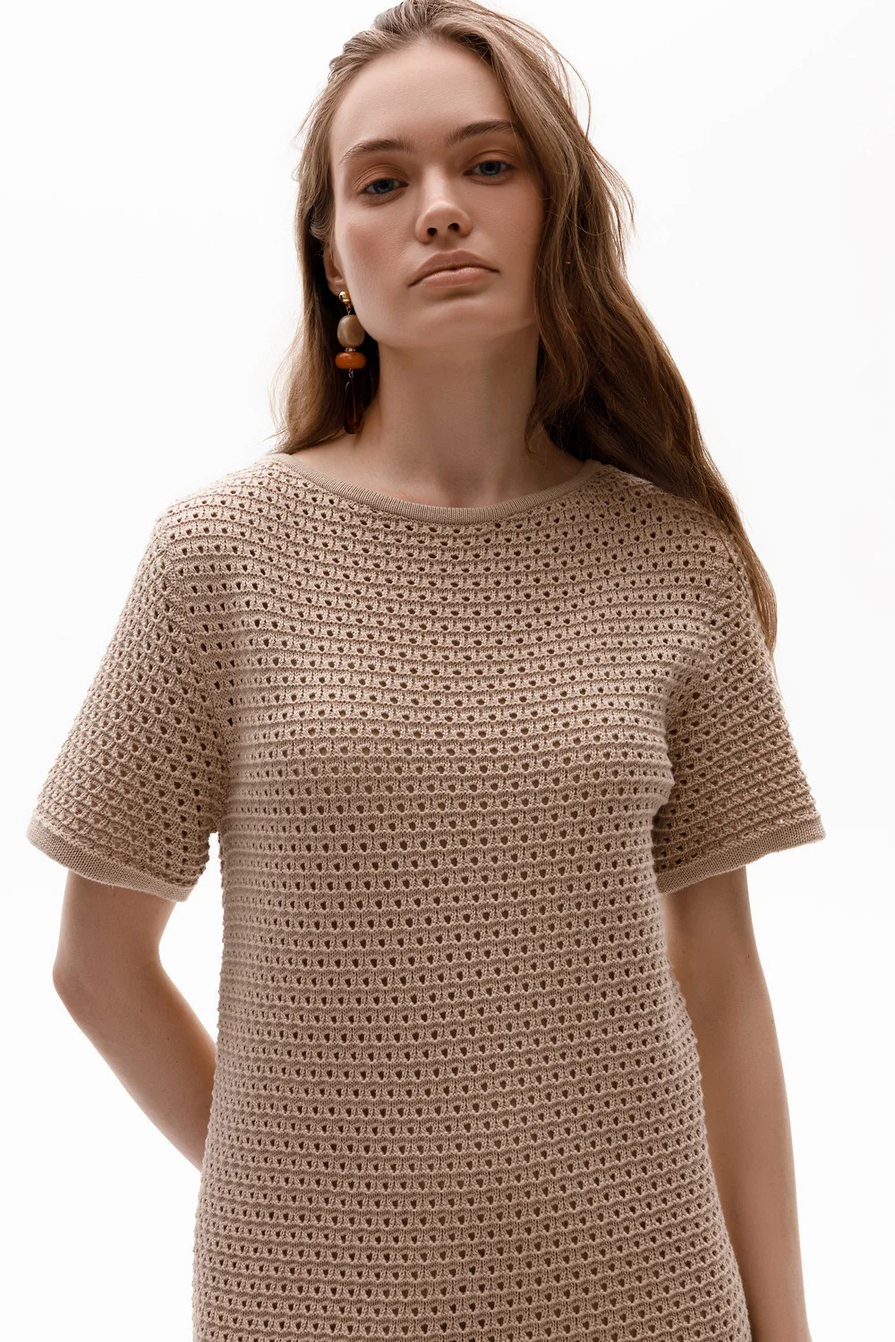 Платье ажурной вязки в универсальном бежевом цвете из итальянского хлопка. Дополняет изделие внутренний невесомый подклад из премиального бифлекса телесного цвета. Хлопок в составе сохраняет форму и дарит ощущение комфорта во время носки.