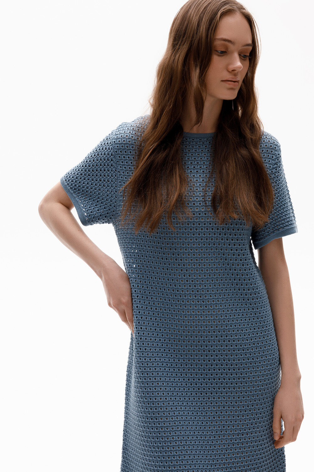 Платье ажурной вязки в нежно-голубом оттенке из итальянского хлопка. Дополняет изделие внутренний невесомый подклад из премиального бифлекса телесного цвета. Хлопок в составе сохраняет форму и дарит ощущение комфорта во время носки.
