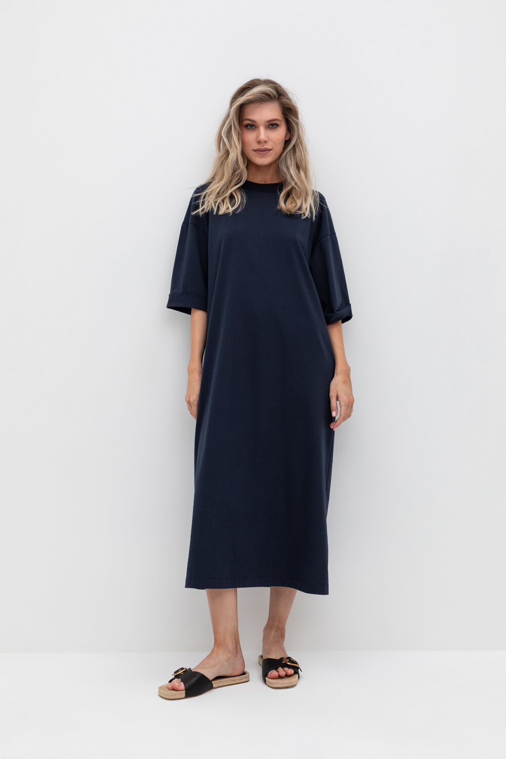 Удлиненное трикотажное платье из длинноволокнистого гребенного хлопка. Спущенное плечо придает изделию свободный силуэт.