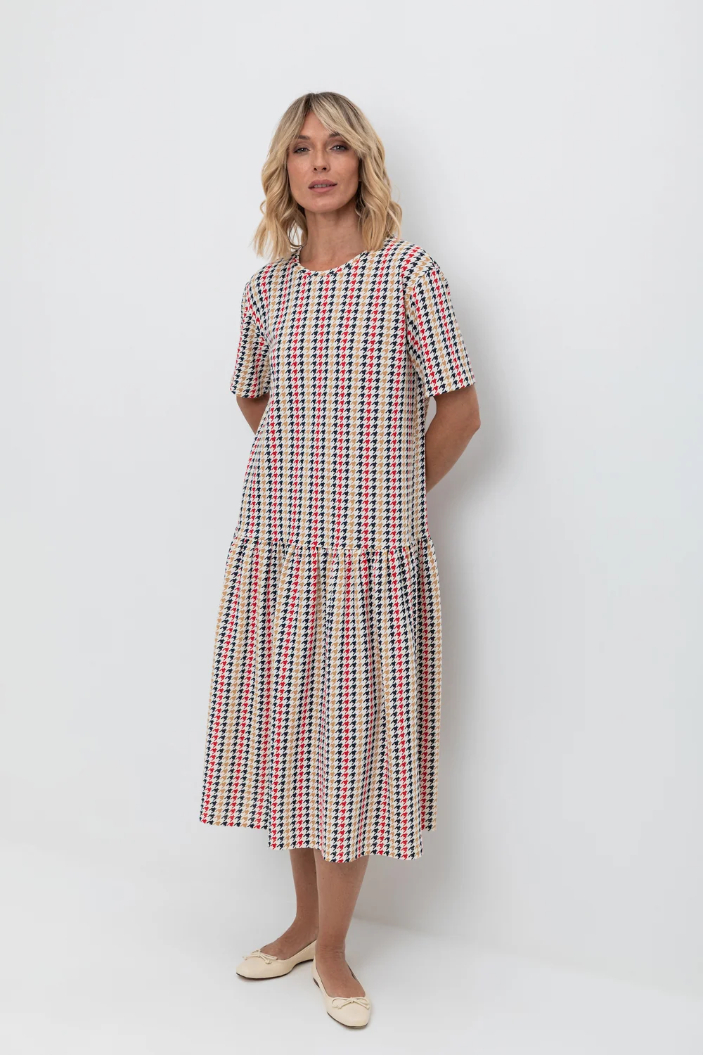 Трикотажное платье с воланом из набивного пике из длинноволокнистого гребенного хлопка. Спущенное плечо придает изделию свободный силуэт.