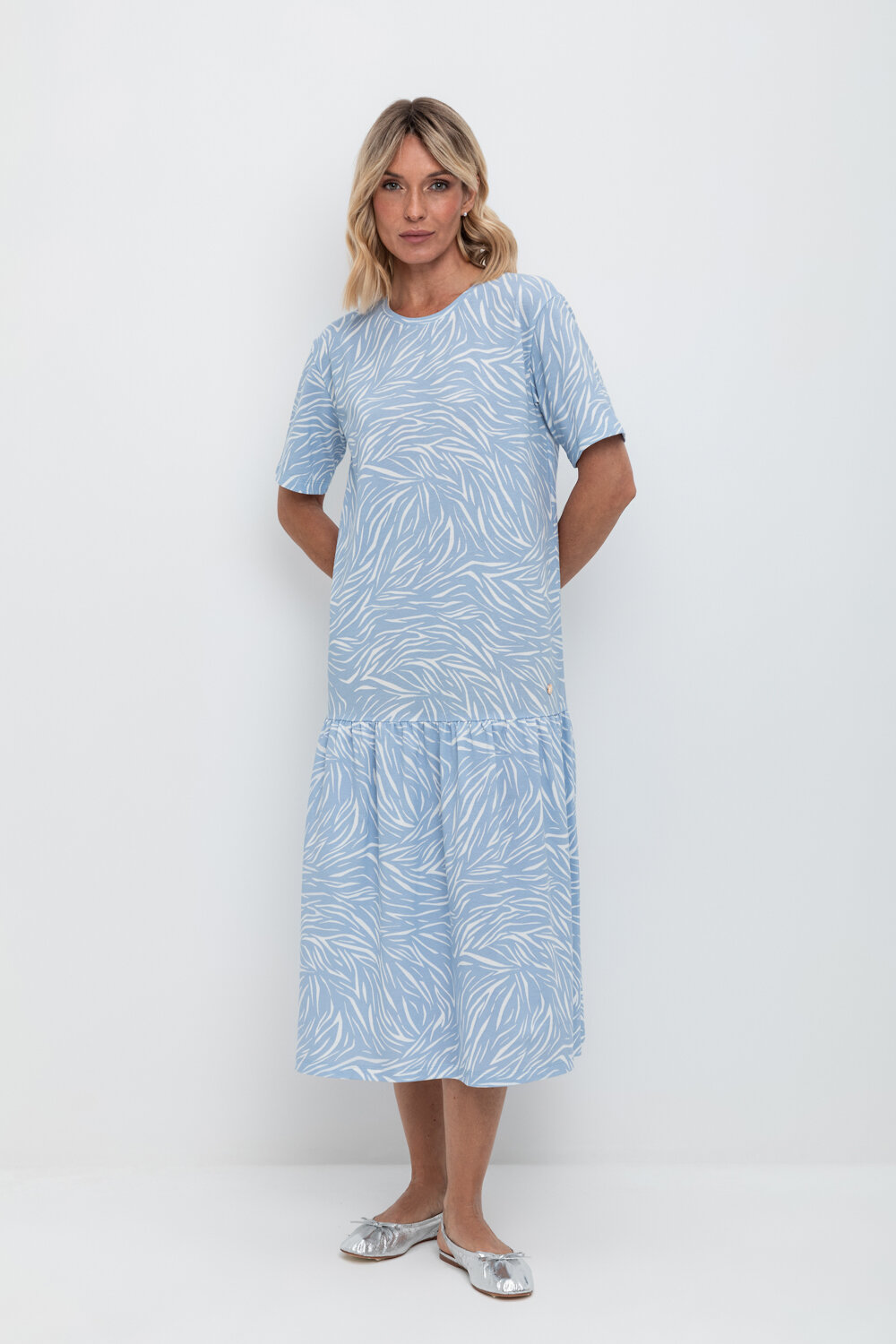 Трикотажное платье с воланом из набивного пике из длинноволокнистого гребенного хлопка. Спущенное плечо придает изделию свободный силуэт.