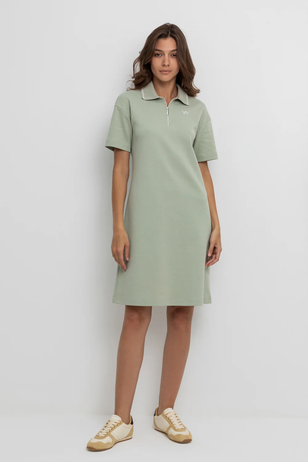 Платье поло с короткими рукавами из плотного гладкого трикотажа интерлок с застежкой на молнию . Спущенное плечо придает изделию свободный силуэт.