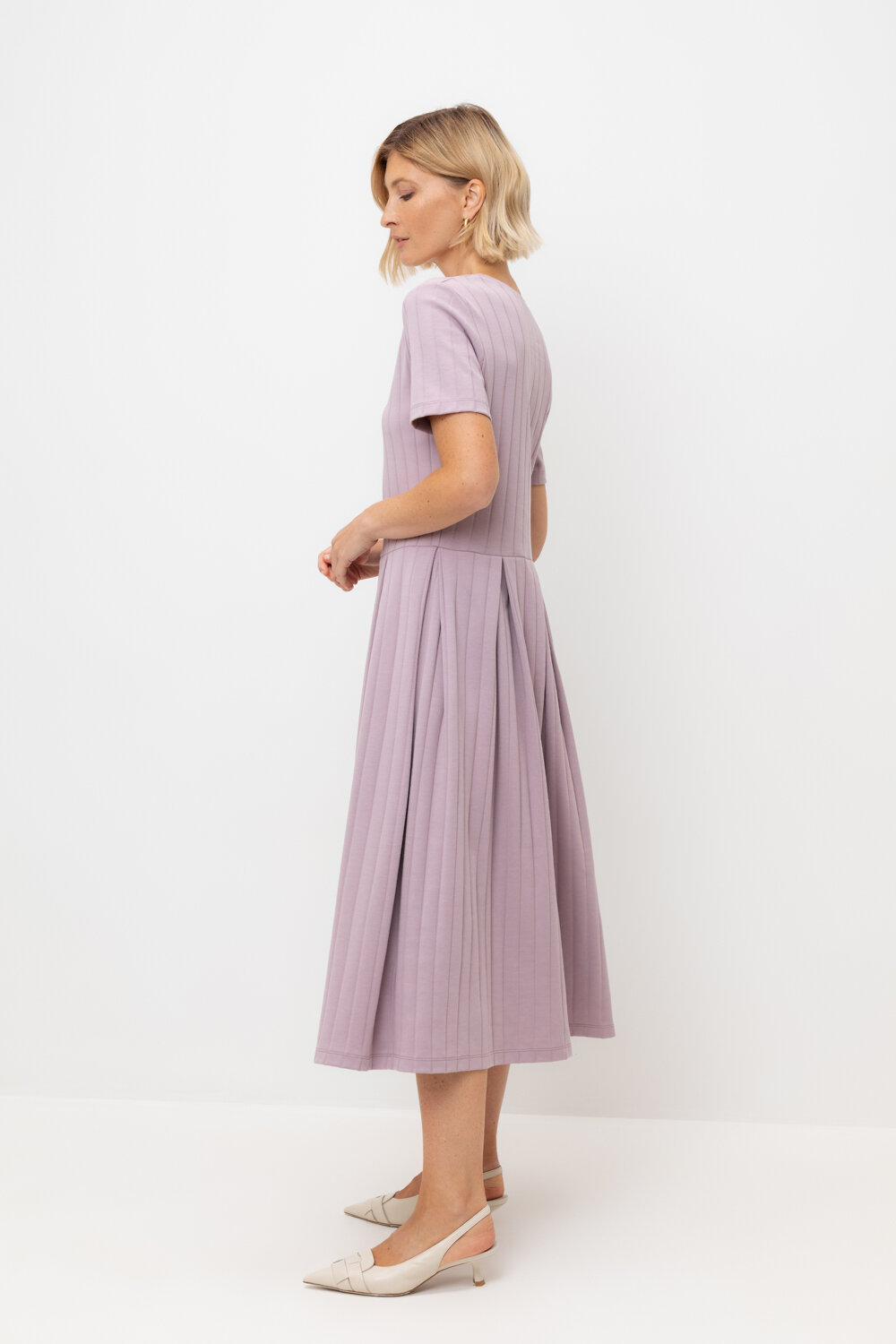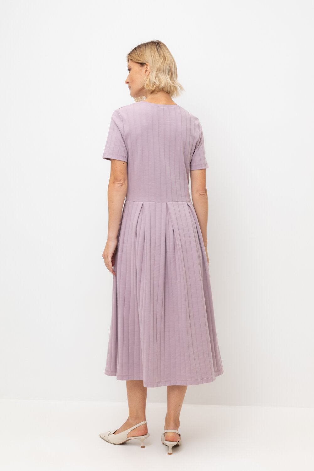 Платье с круглым вырезом и короткими рукавами из плотного гладкого трикотажа интерлок в рубчик. Все трикотажные полотна производятся в соответствии с нормами Швейцарского сертификата ЭкоТекс. Сделано в России