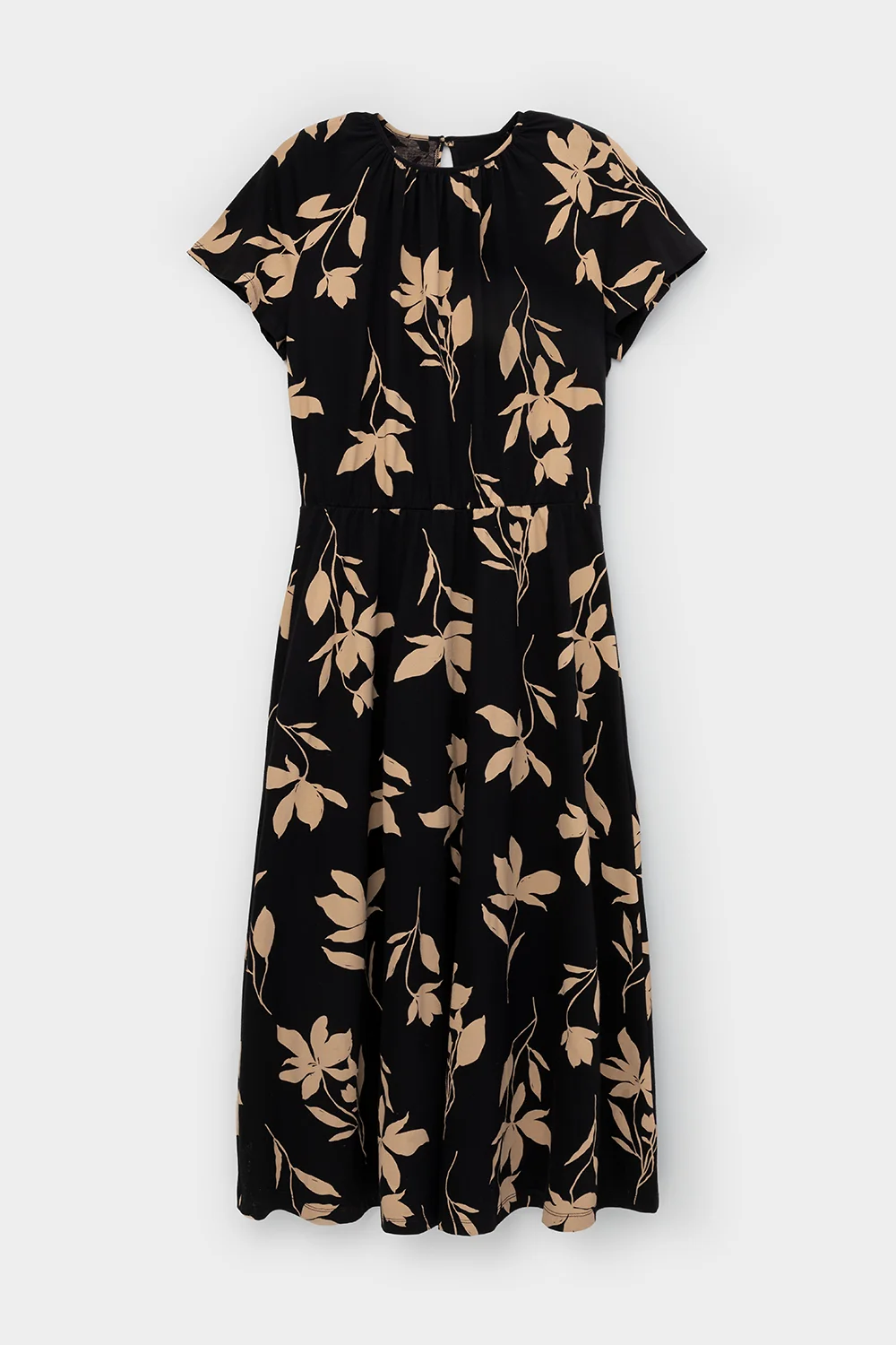 Легкое платье с круглым вырезом со сборками, короткими свободными рукавами из набивного трикотажа супрем. По спинке застежка на пуговицу и петельку. Пояс на мягкой резинке. Все трикотажные полотна производятся в соответствии с нормами Швейцарского сертификата ЭкоТекс. Сделано в России