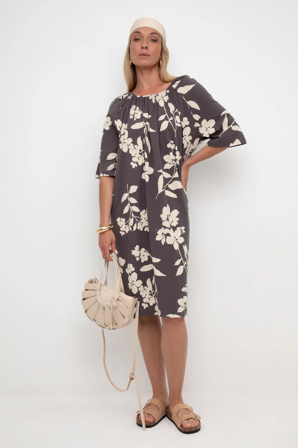 Легкое свободное платье с круглым вырезом на сборке, короткими рукавами из набивного трикотажа супрем.