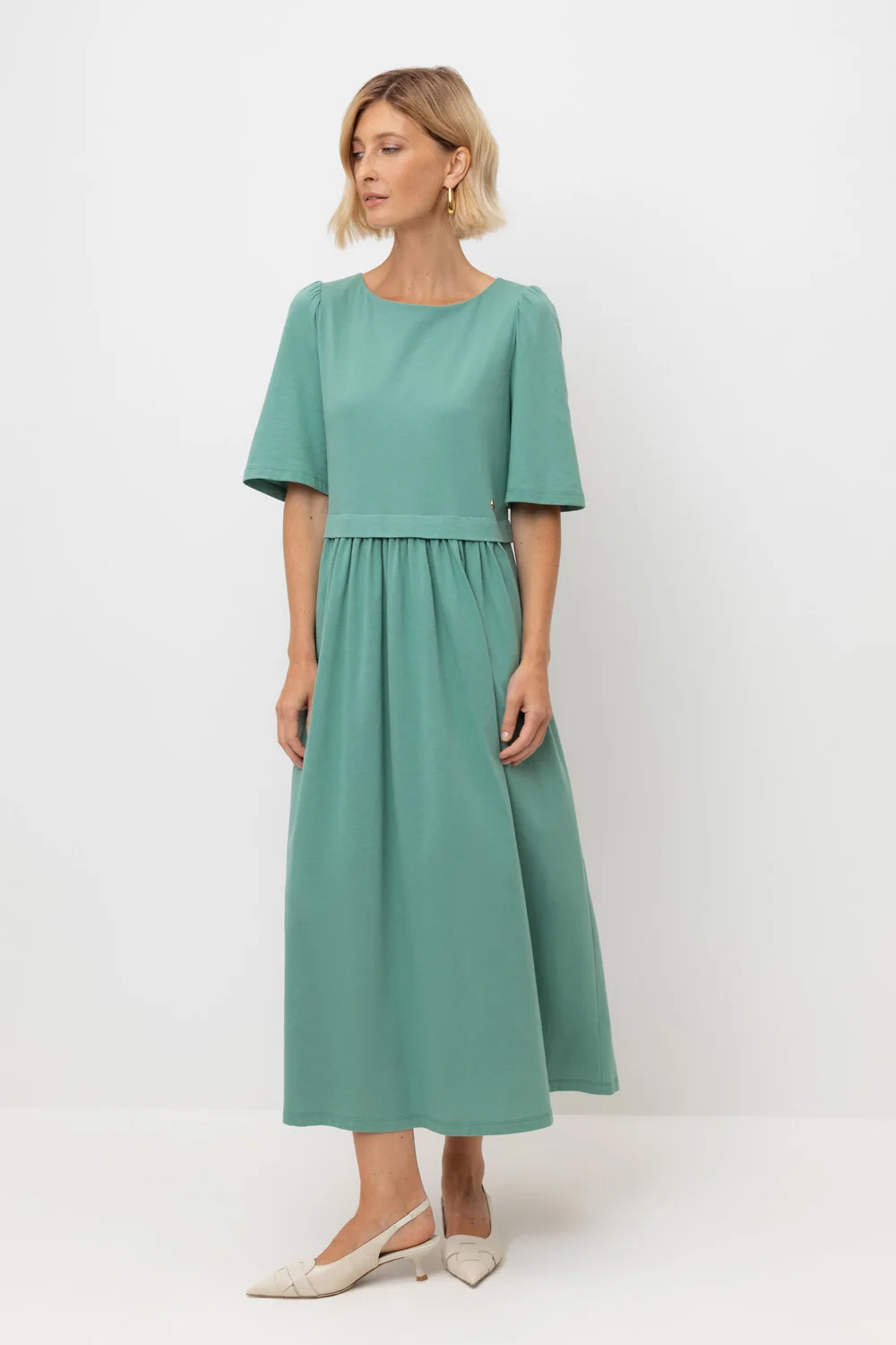 Легкое трикотажное платье из высококачественного гребенного хлопка, который обеспечивает комфорт в жаркую погоду. Свободу движения придает силуэт, сборка по рукаву и поясу романтичности, а наличие боковых карманов - функциональности.