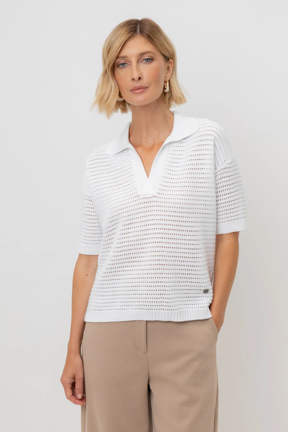 Воздушное поло ажурной вязки из итальянского хлопка. Мягкий воротник без застежки в стиле поло и спущенная линия плеча добавляет легкости при создании летних образов.