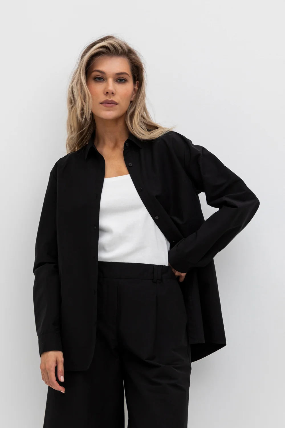 Рубашка свободного кроя из смесового хлопка с добавлением эластана со спущенной линией плеча и длинными рукавами с манжетами на пуговицах.