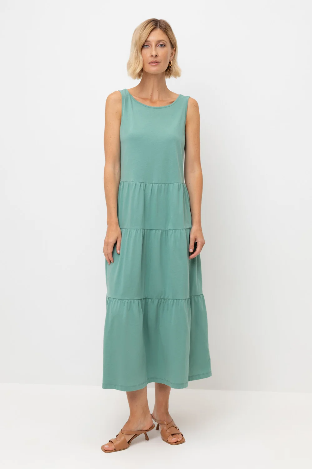 Воздушный трикотажный сарафан из высококачественного гребенного хлопка, который обеспечивает комфорт в жаркую погоду. Трехступеньчатые воланы, выбранная длина и утонченный вырез на спине создают из базового лекала стильное решение на сезон.