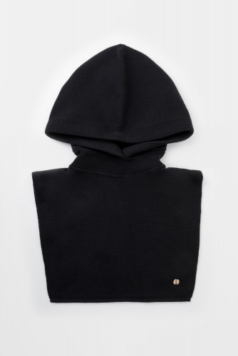 Теплый вязаный капор с глубоким капюшоном из шерсти и акрила. Шерсть в составе хорошо удерживает тепло, а волокна акрила делают изделие мягким и предотвращают деформацию и появление катышек. Лаконичный крой хорошо сочетается с верхней одеждой.