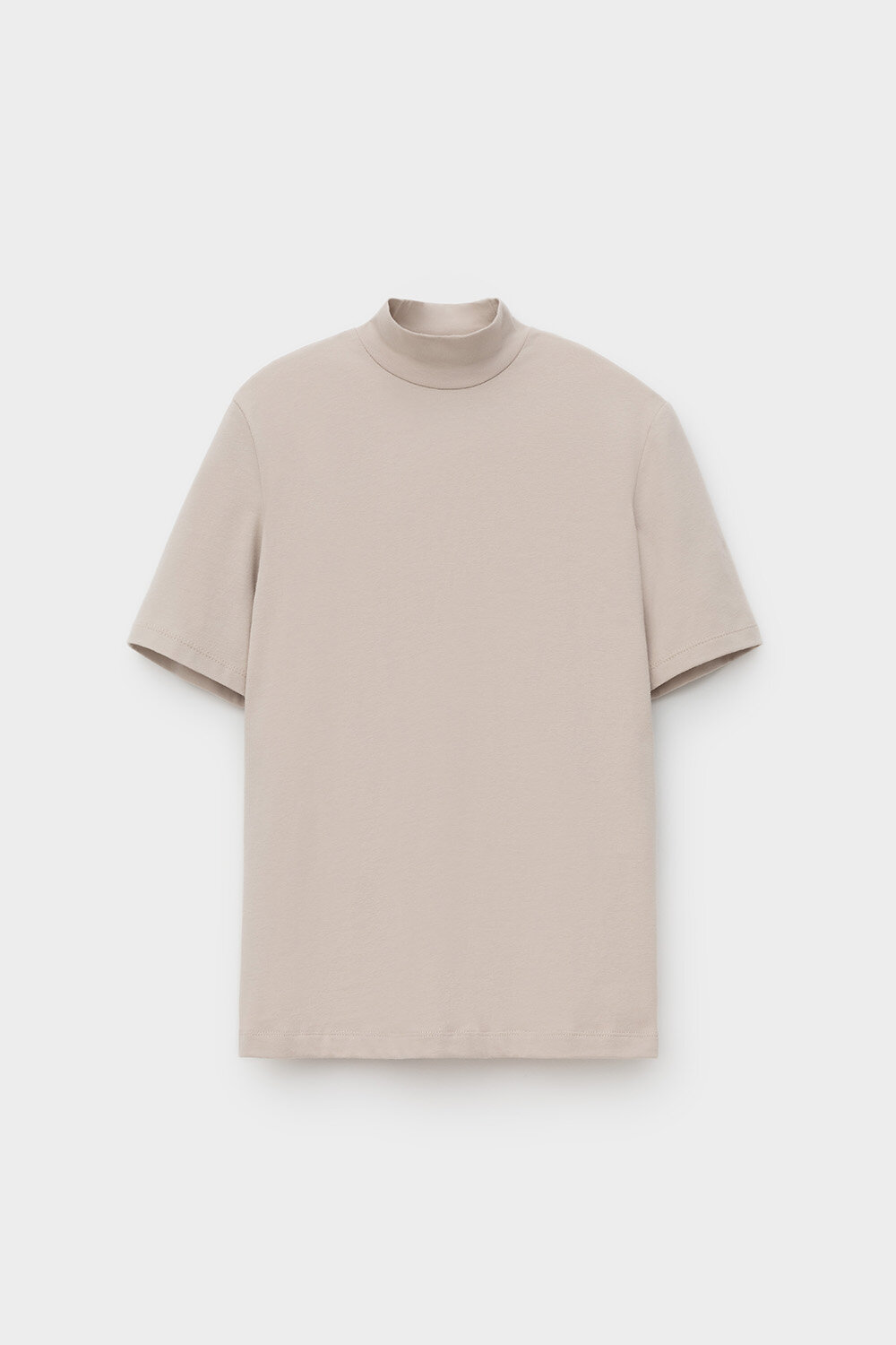 Базовый джемпер с короткими рукавами и воротником-стойкой из плотного однотонного трикотажа супрем с добавлением спандекса.