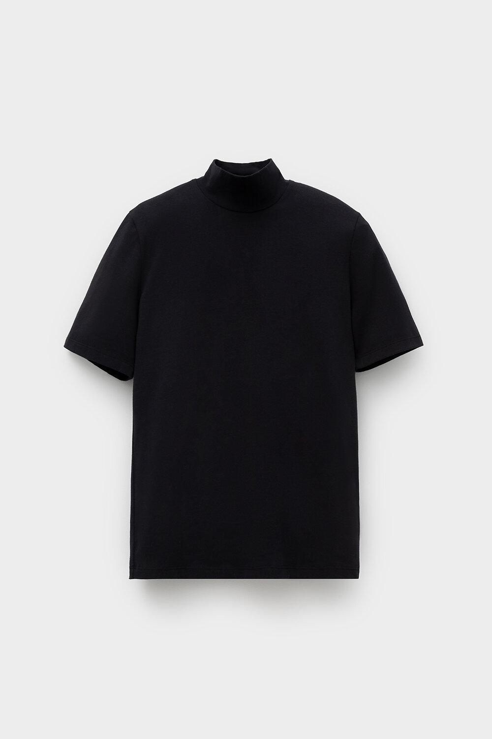Базовый джемпер с короткими рукавами и воротником-стойкой из плотного однотонного трикотажа супрем с добавлением спандекса.