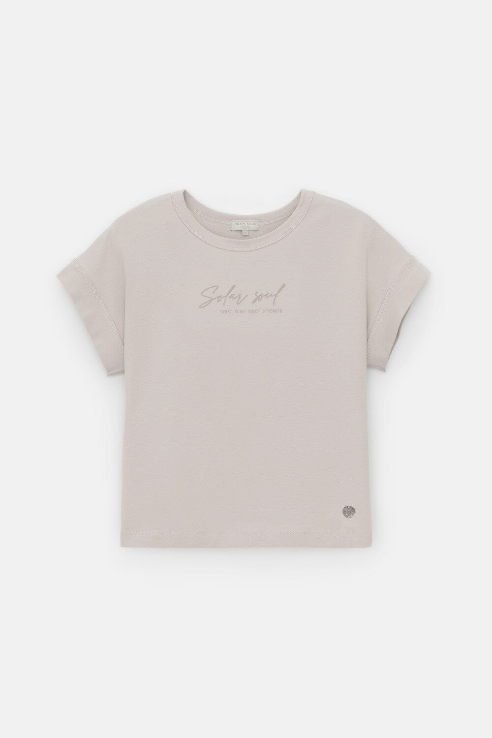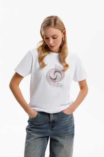 Футболка прямого силуэта из высококачественного гребенного хлопка с добавлением эластана. Нежная и струящаяся фактура полотна за счет специальной обработки soft touch дает ощущение комфорта в жаркие летние дни. Мягкий на ощупь принт выполнен из водных красок, что обеспечивает устойчивость к многократным стиркам.