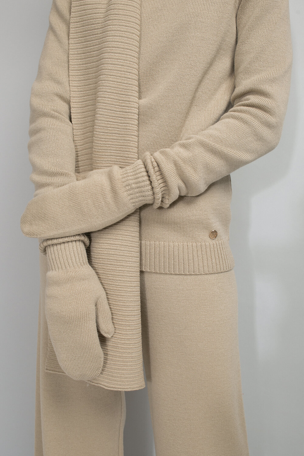 Однотонный вязаный шарф. Связан резинкой. Украшен металлическим значком с тиснёнными буквами VN и фирменной этикеткой.