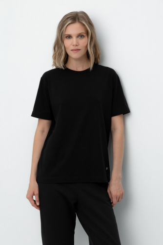 Свободная футболка из набивного трикотажа супрем. Спущенное плечо придает изделию свободный силуэт.