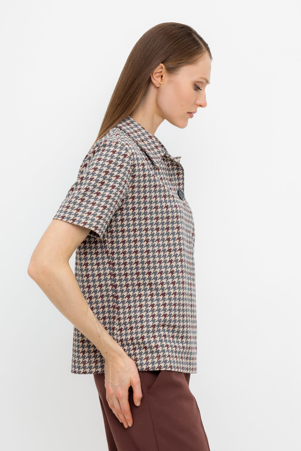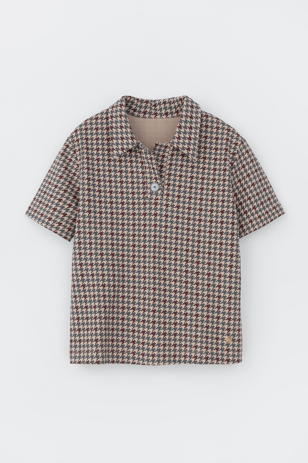 Джемпер поло с короткими рукавами из интерлока с V-образным вырезом и декоративной пуговицей.