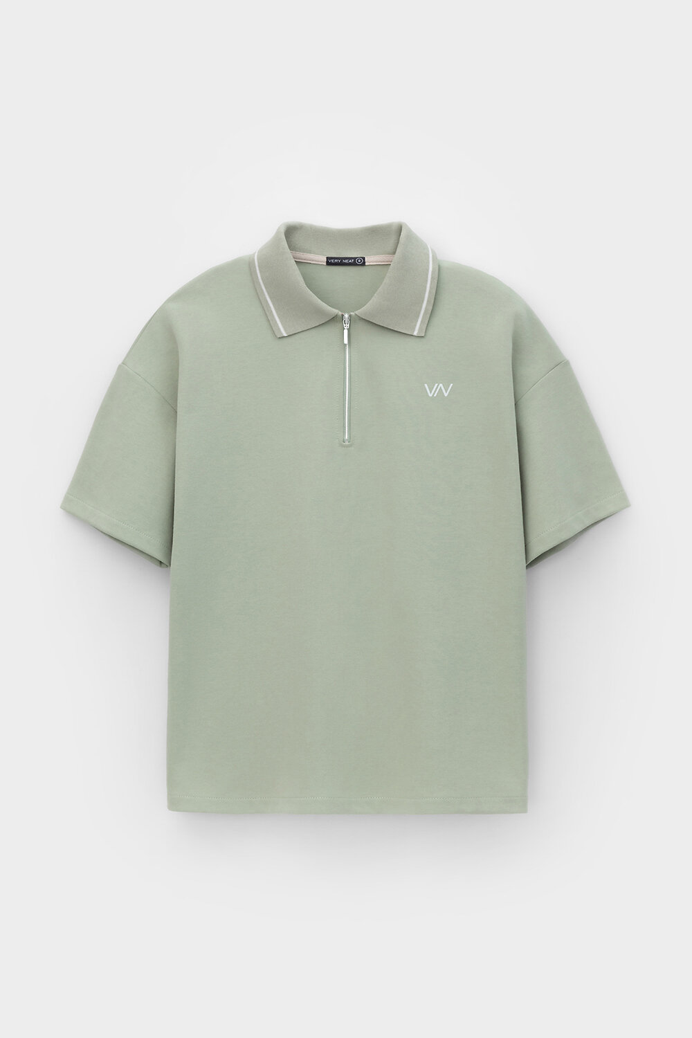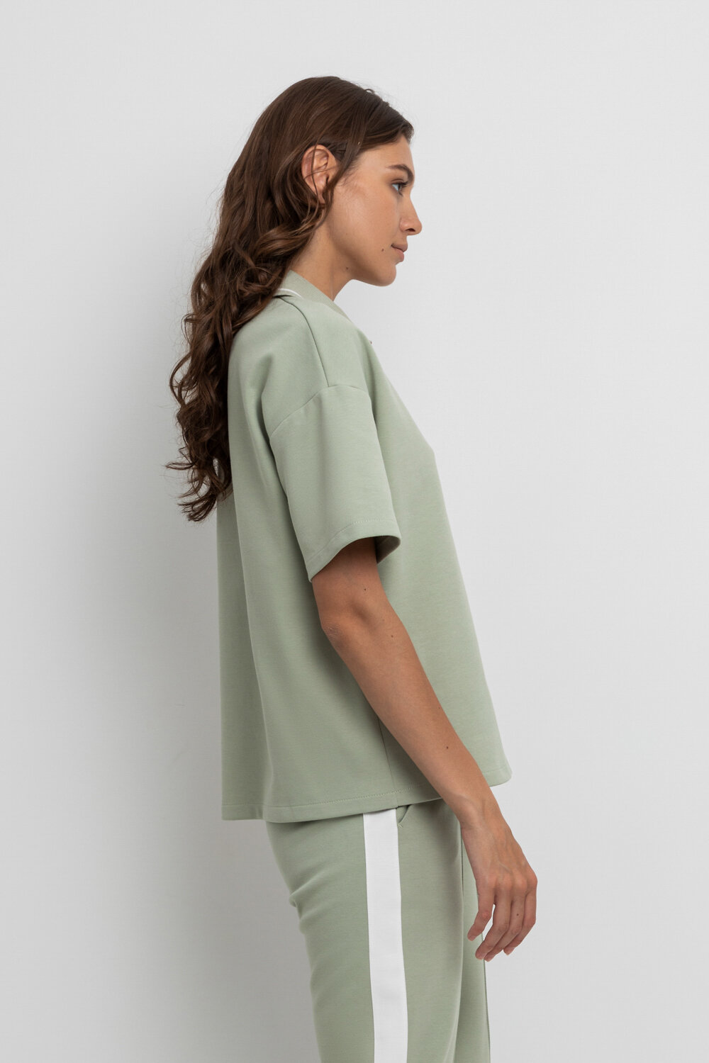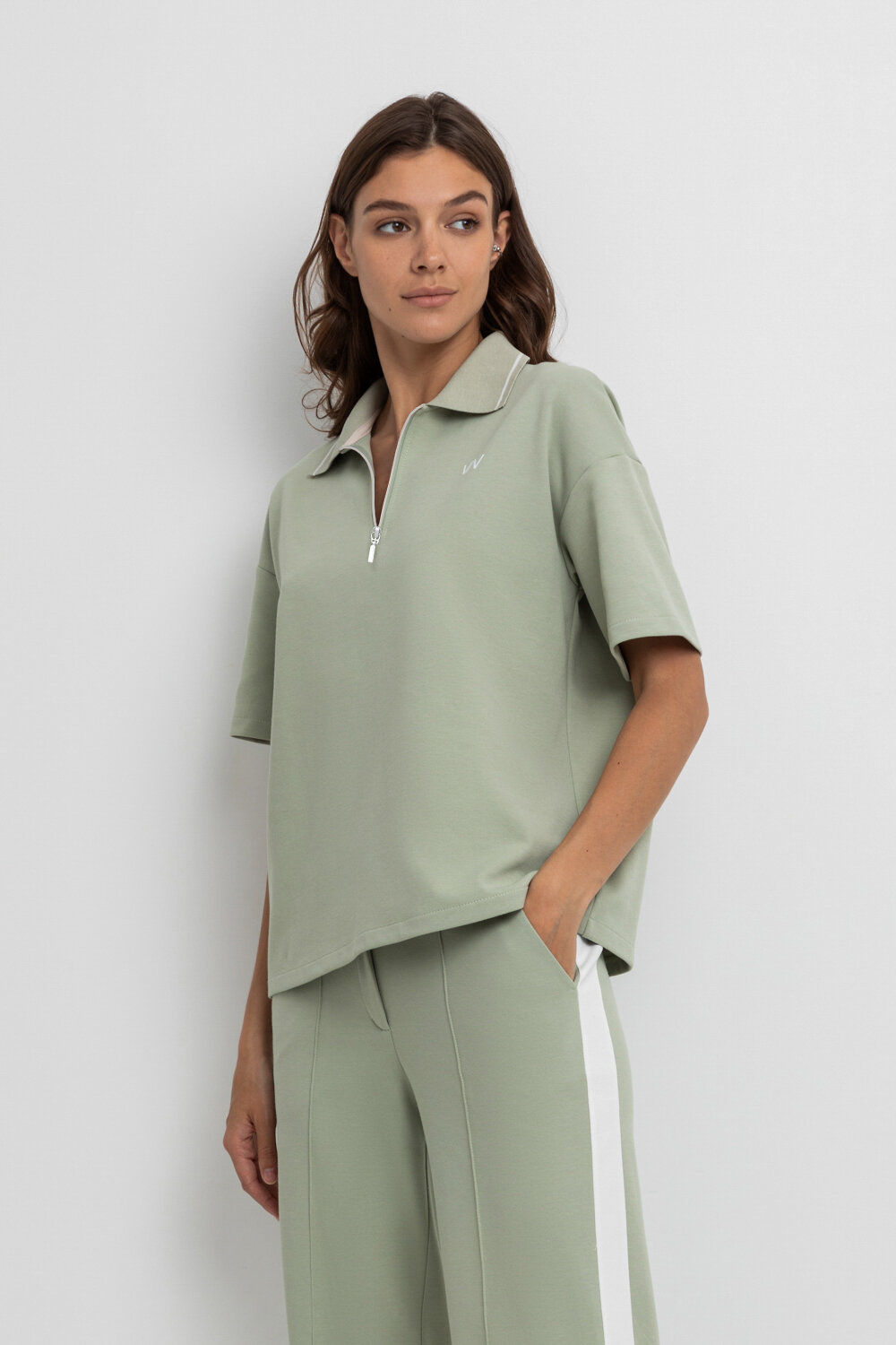 Джемпер поло с короткими рукавами с принтом и вязаным воротником из плотного гладкого трикотажа интерлок с застежкой на молнию . Спущенное плечо придает изделию свободный силуэт.