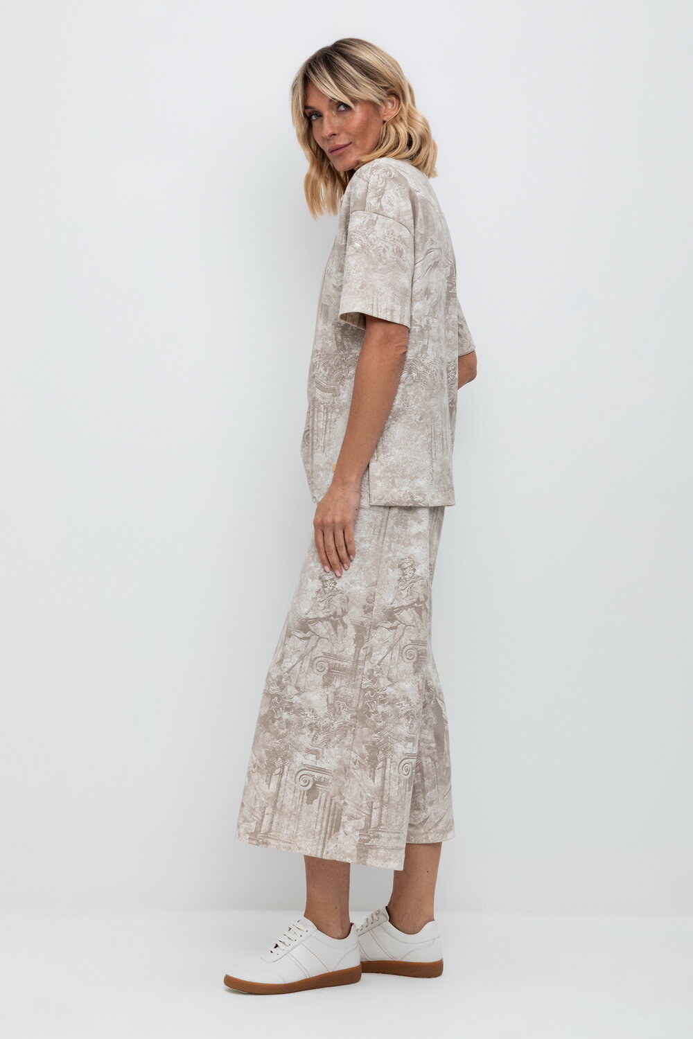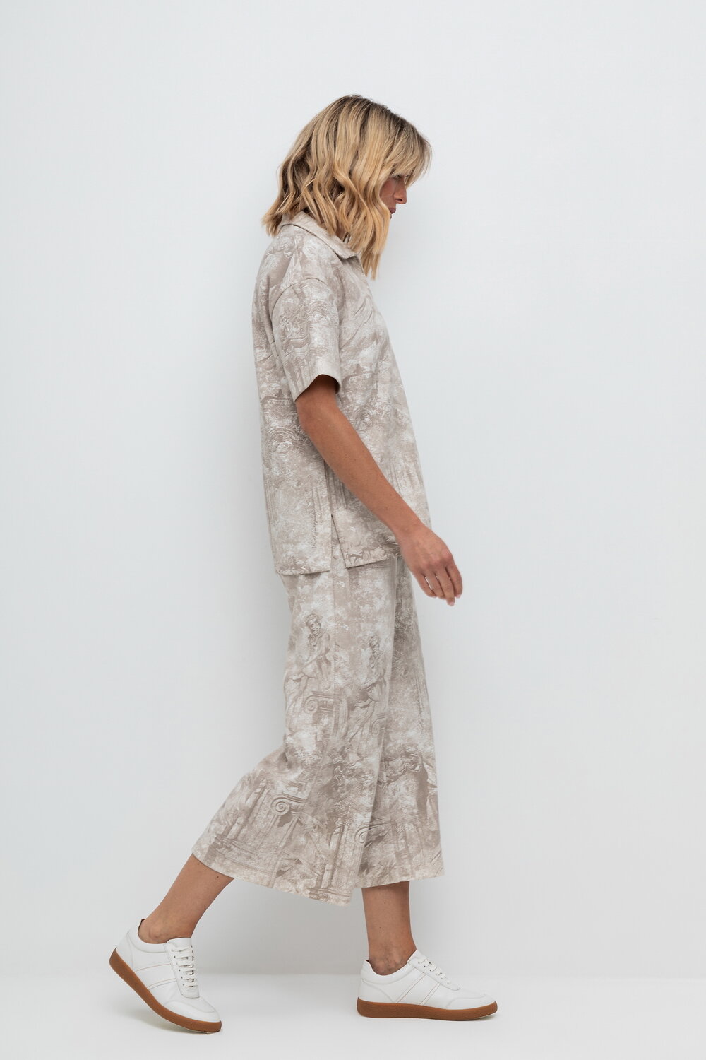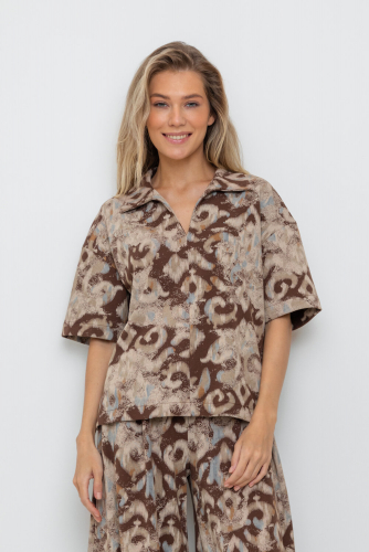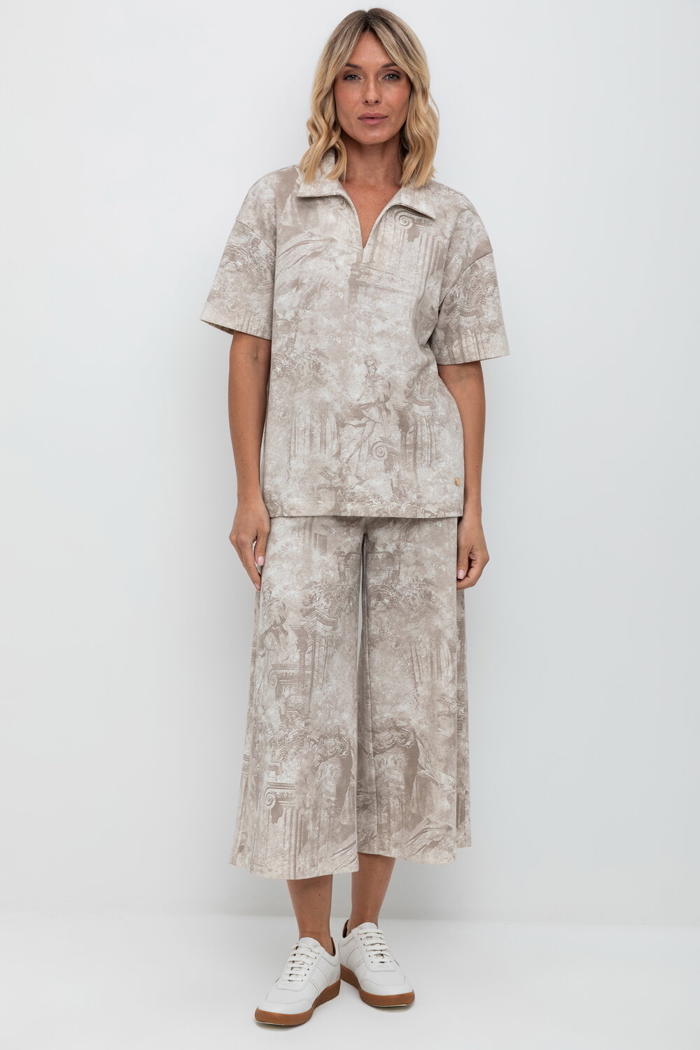 Джемпер поло с короткими рукавами из плотного набивного трикотажа интерлок с V-образным вырезом. Спущенное плечо придает изделию свободный силуэт.