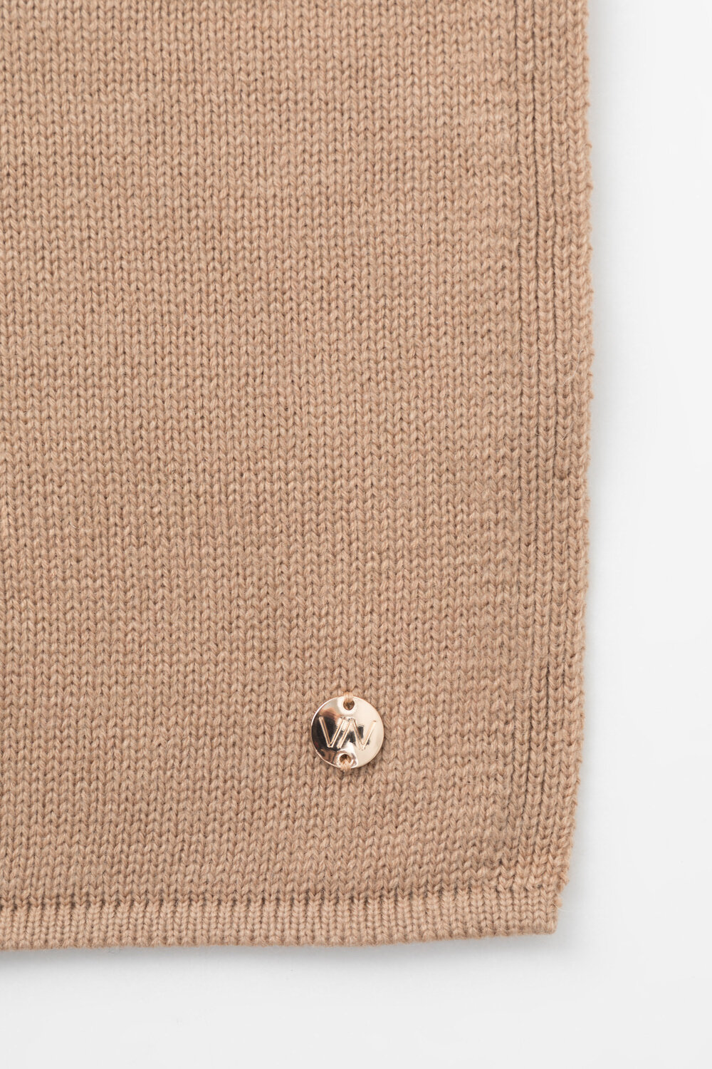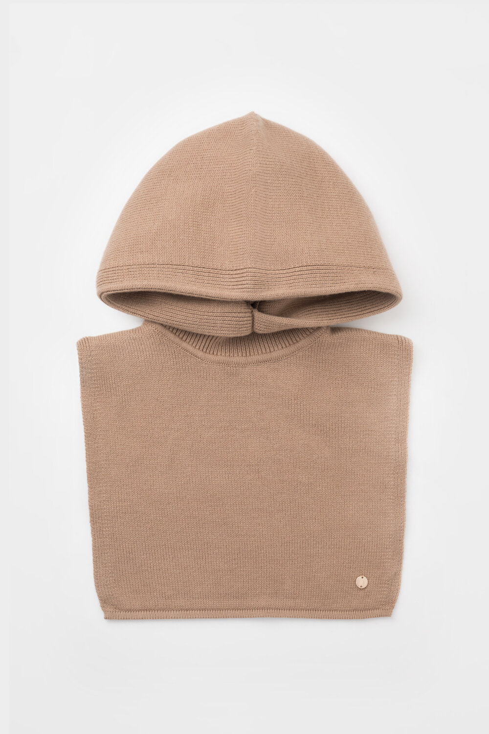 Теплый вязаный капор с глубоким капюшоном из шерсти и акрила. Шерсть в составе хорошо удерживает тепло, а волокна акрила делают изделие мягким и предотвращают деформацию и появление катышек. Лаконичный крой хорошо сочетается с верхней одеждой.