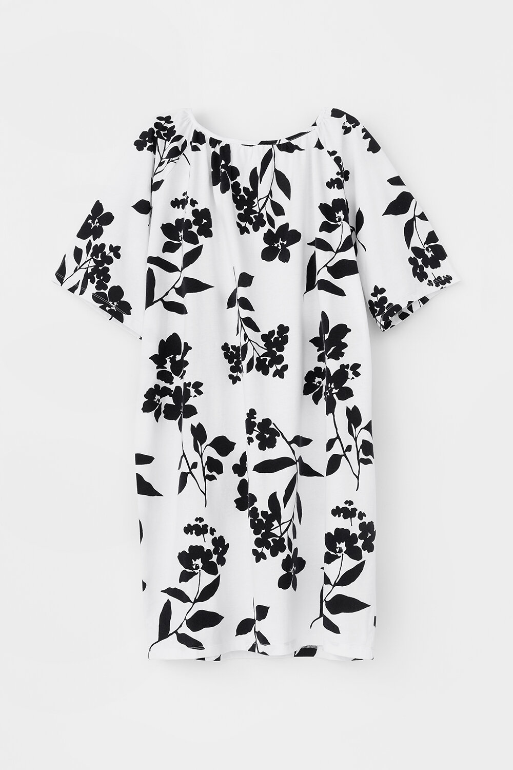 Легкое свободное платье с круглым вырезом на сборке, короткими рукавами из набивного трикотажа супрем.