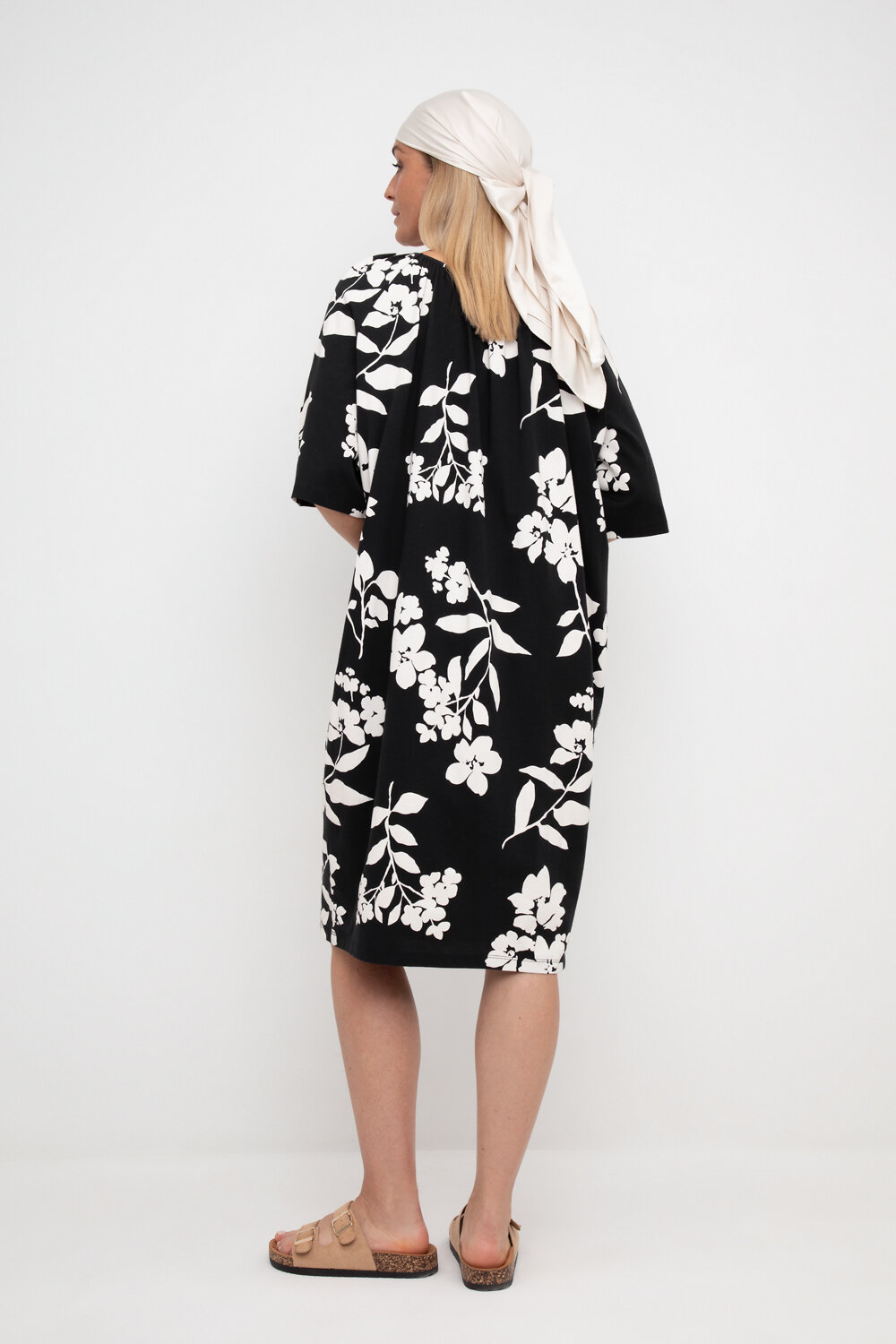 Легкое свободное платье с круглым вырезом на сборке, короткими рукавами из набивного трикотажа супрем.