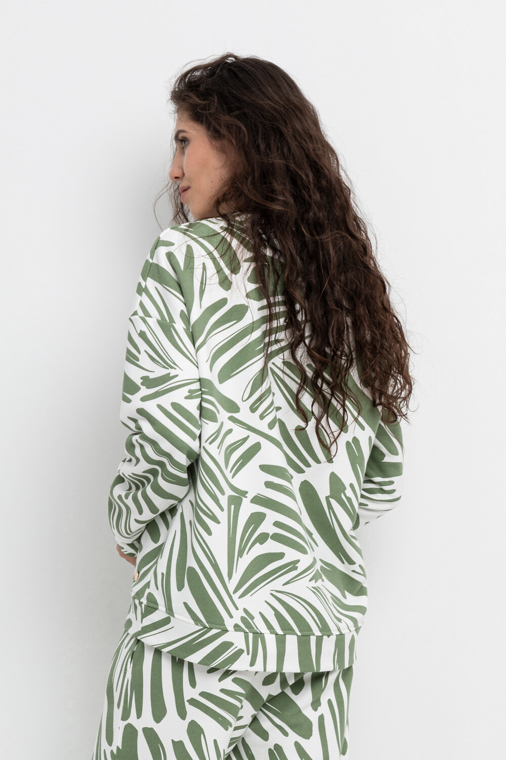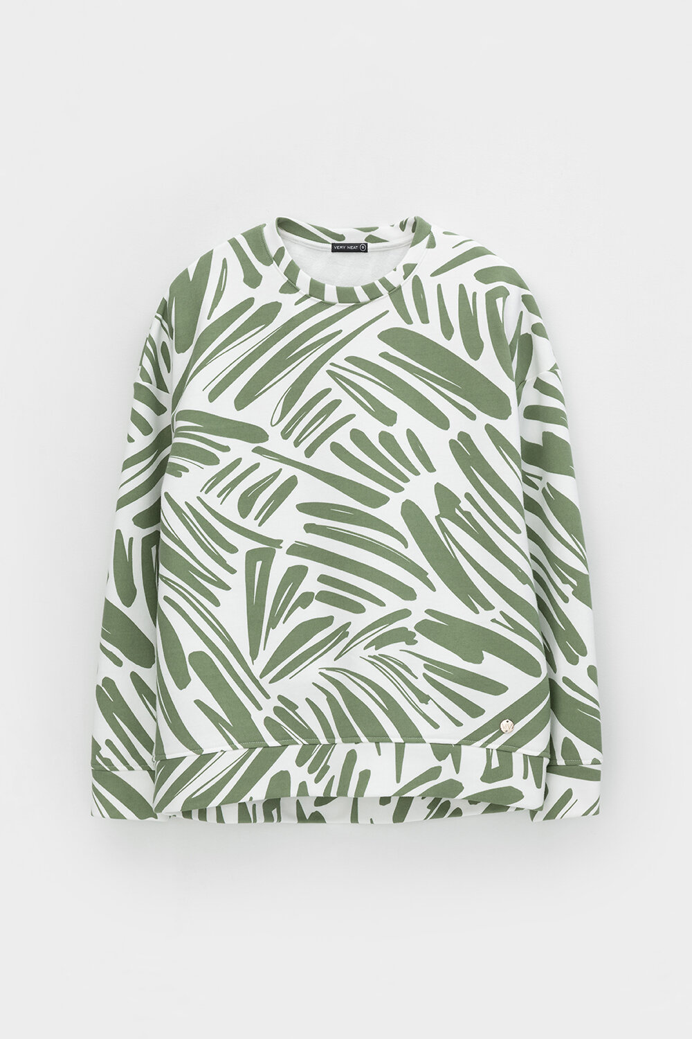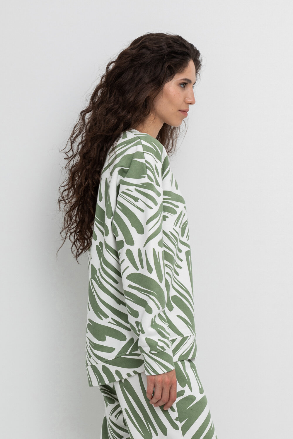 Мягкая женская толстовка из набивного футера трехнитки. Спущенные рукава и манжеты добавляют объем.