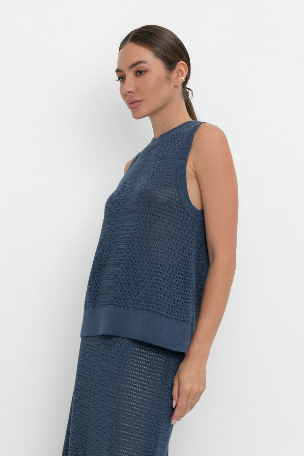 Вязаная ажурная майка. Состав 50% хлопок, 50% акрил. Благодаря акрилу в составе изделие не пилингуется.