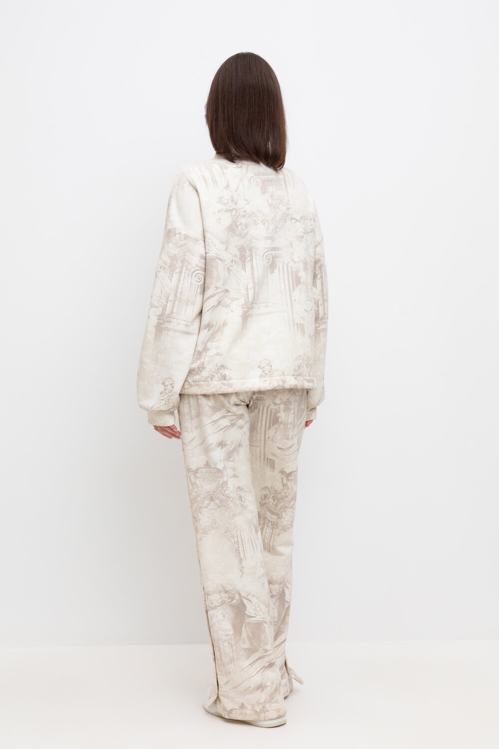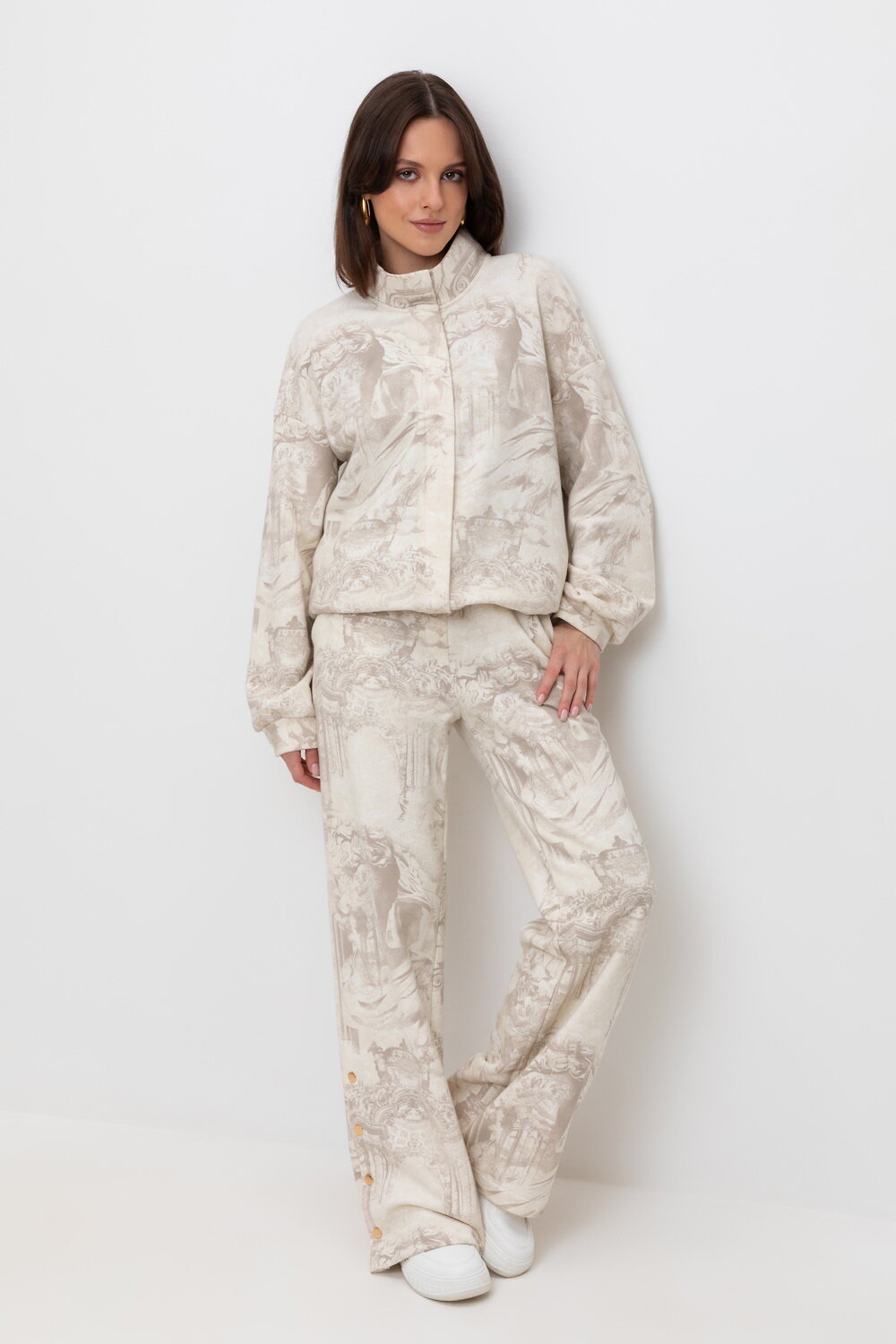 Свободные женские брюки с боковыми карманами из мягкого набивного футера двухнитки. Модель с разрезами по низу, застегивающиеся на кнопки. Низ обработан плоскими швами.