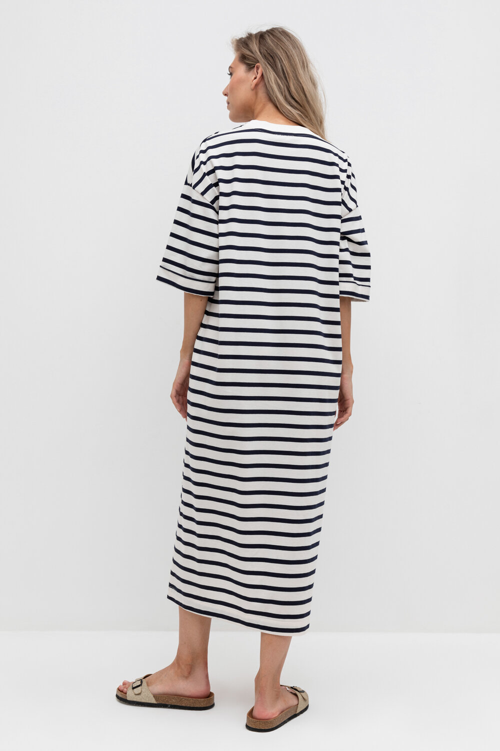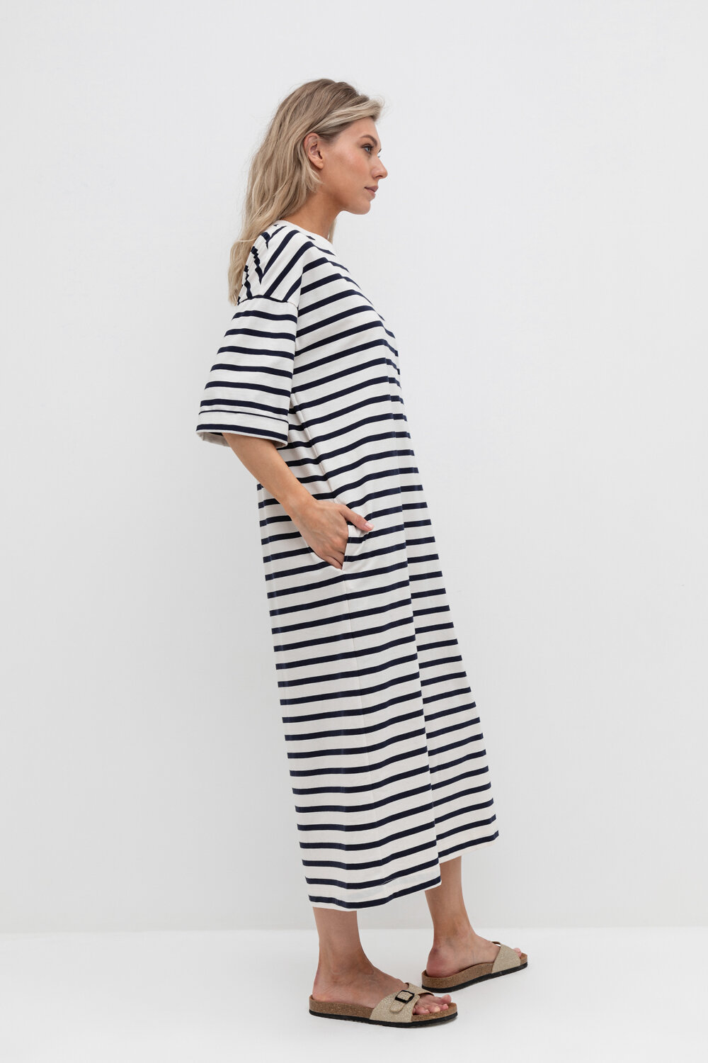 Трикотажное платье в полоску из длинноволокнистого гребенного хлопка. Спущенное плечо придает изделию свободный силуэт.