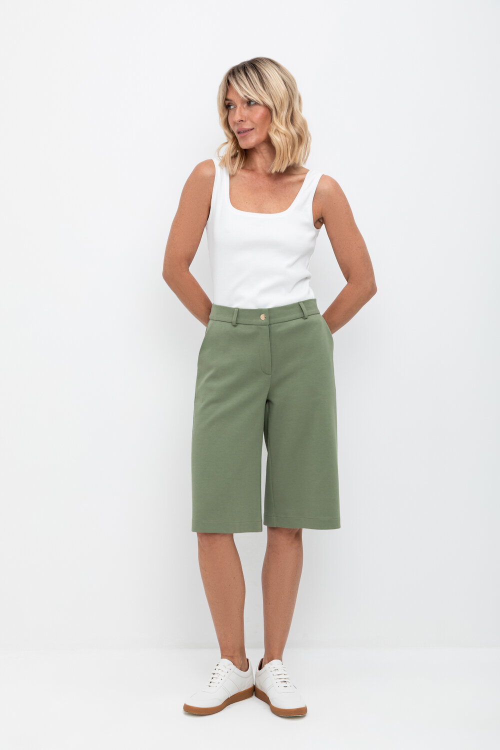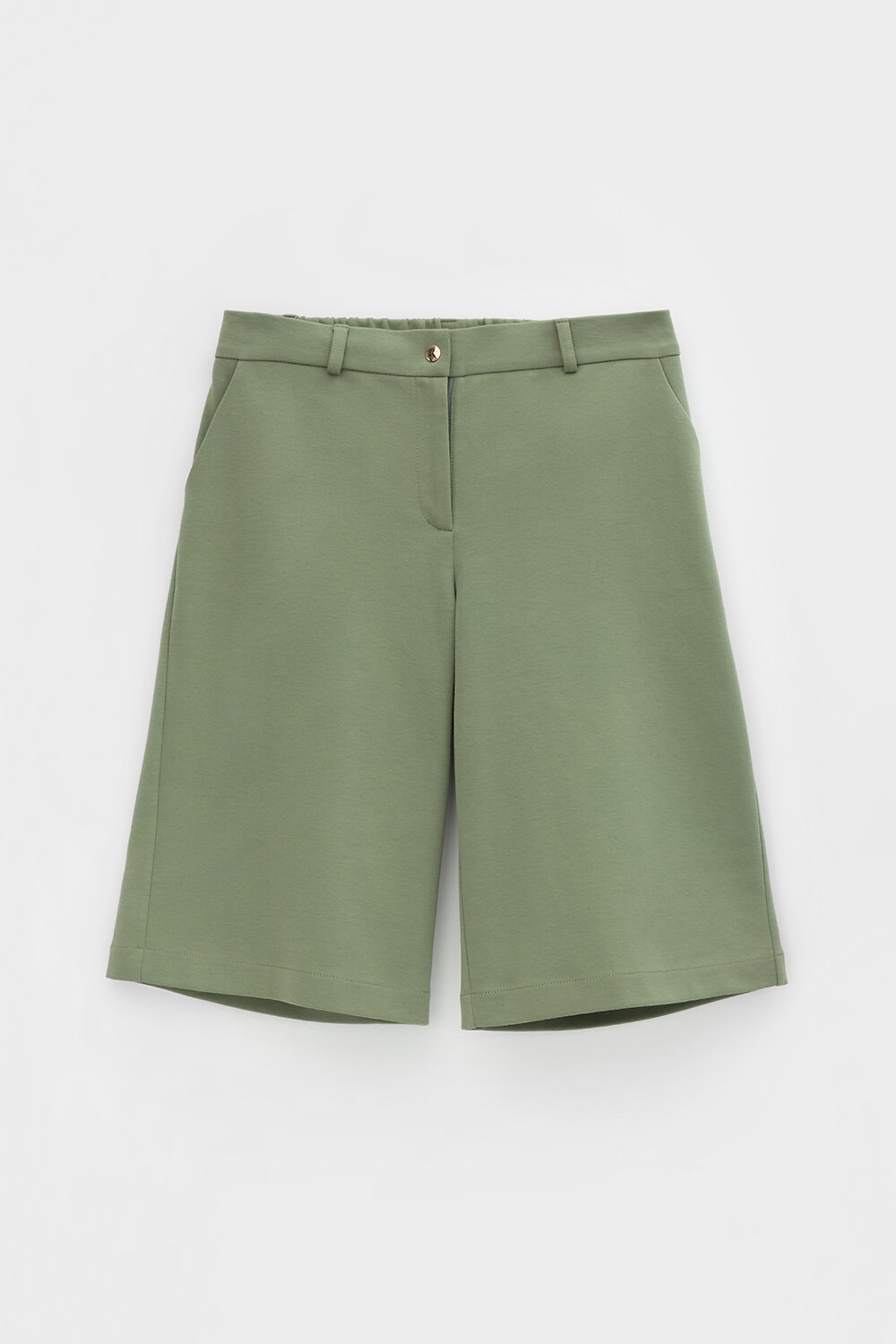 Удлиненные женские шорты с удобными карманами из плотного трикотажа интерлок. Низ обработан плоскими швами.