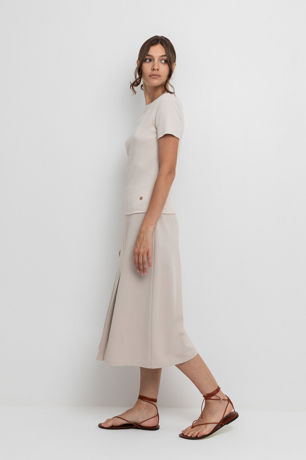 Юбка миди трапециевидной формы с отлетной деталью с разрезами из плотного гладкого трикотажа интерлок.