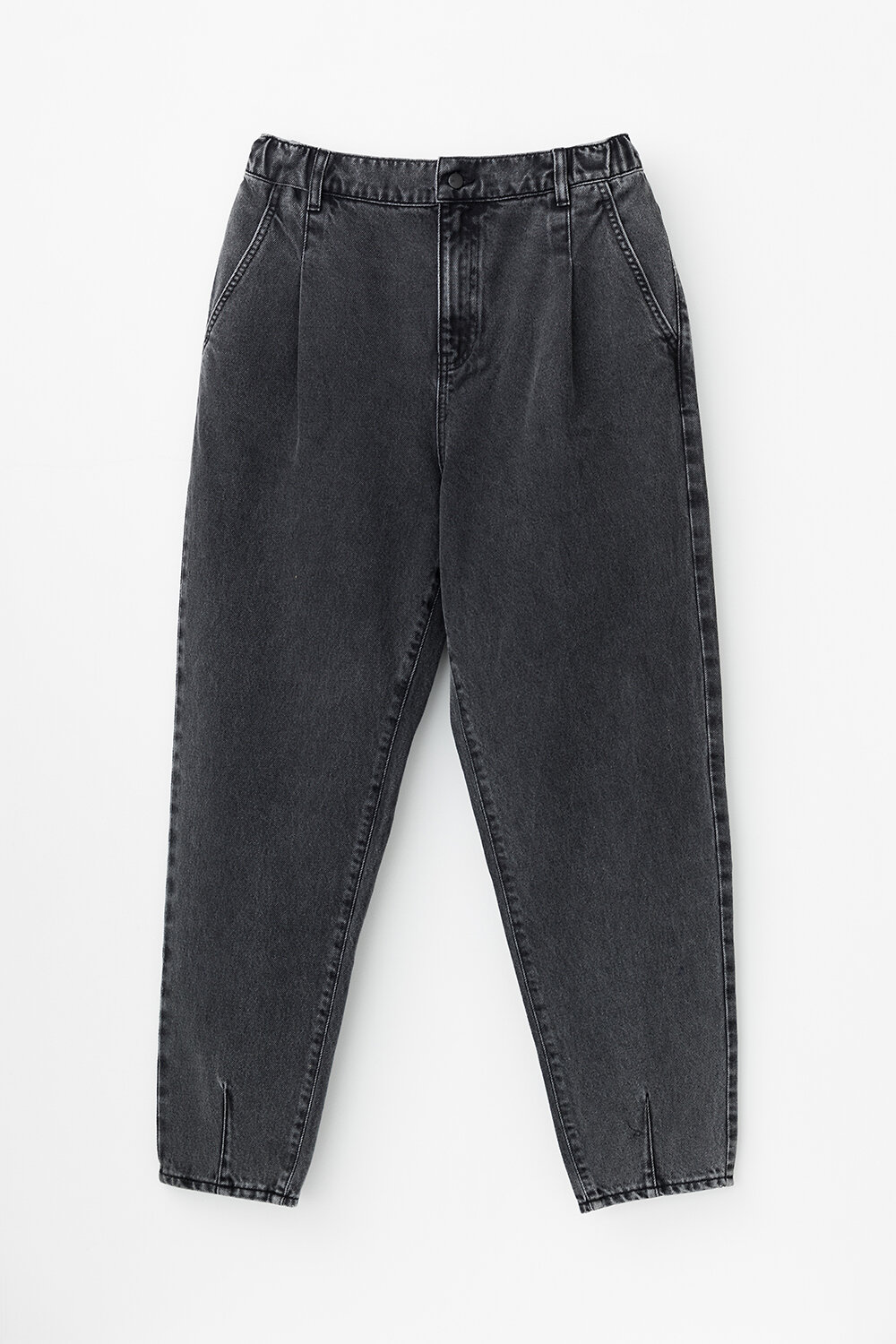 Женские джинсы из 100% хлопка свободного кроя, зауженные книзу, с поясом на резинке и завышенной линией талии. Модель с классическими 5 карманами и подворотами.