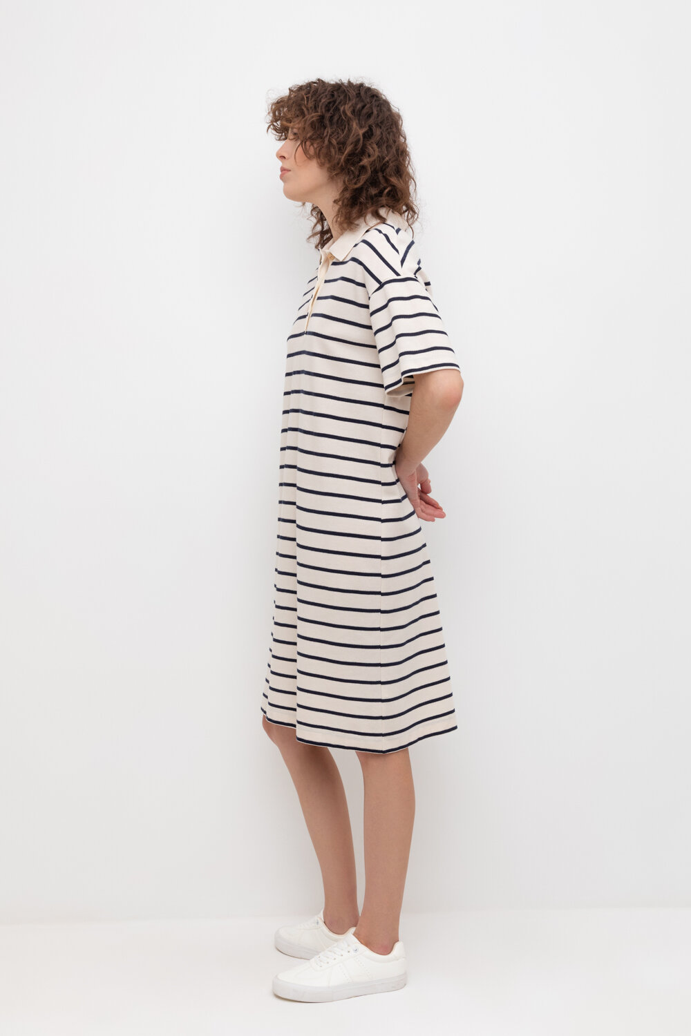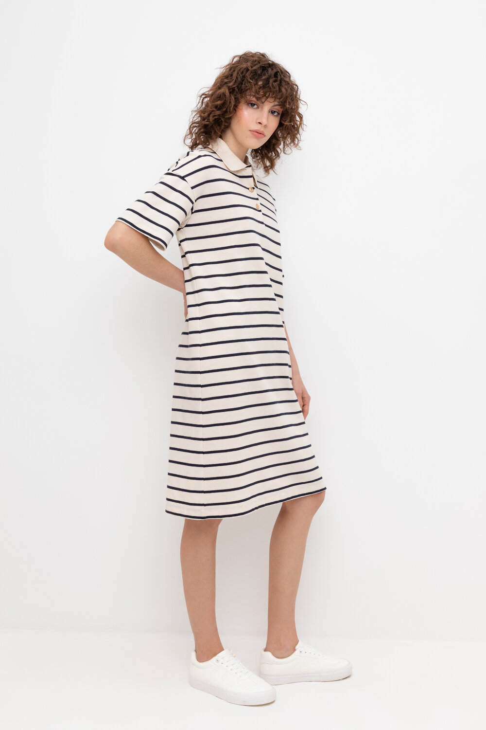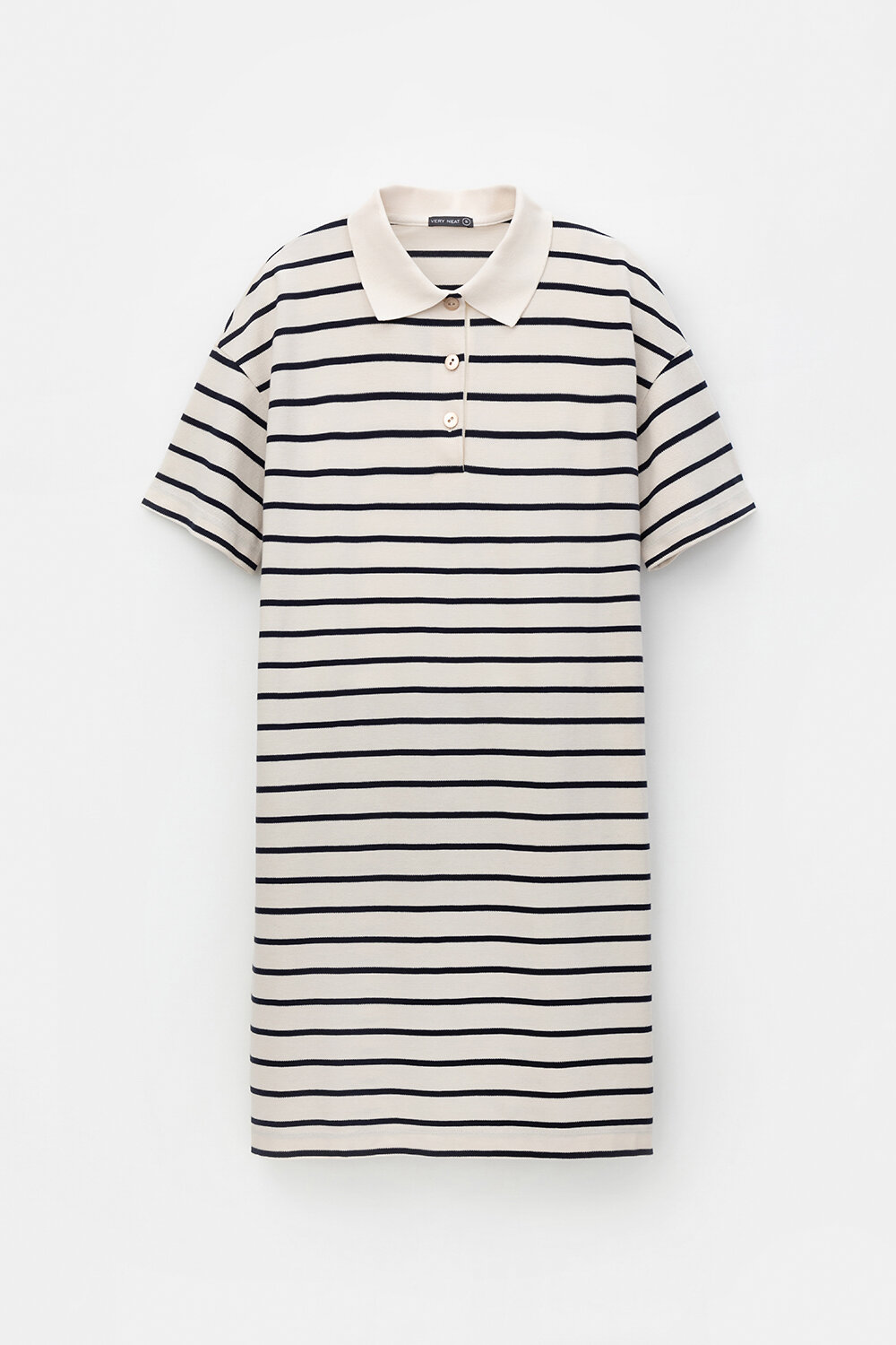 Трикотажное платье-поло в полоску из длинноволокнистого гребенного хлопка. Спущенное плечо придает изделию свободный силуэт.