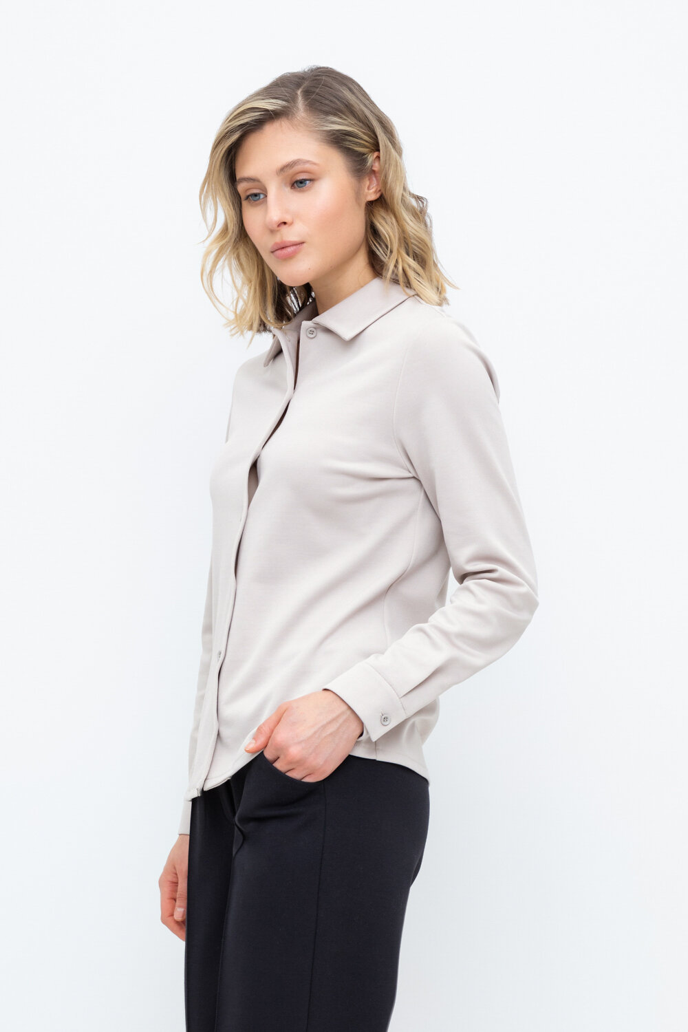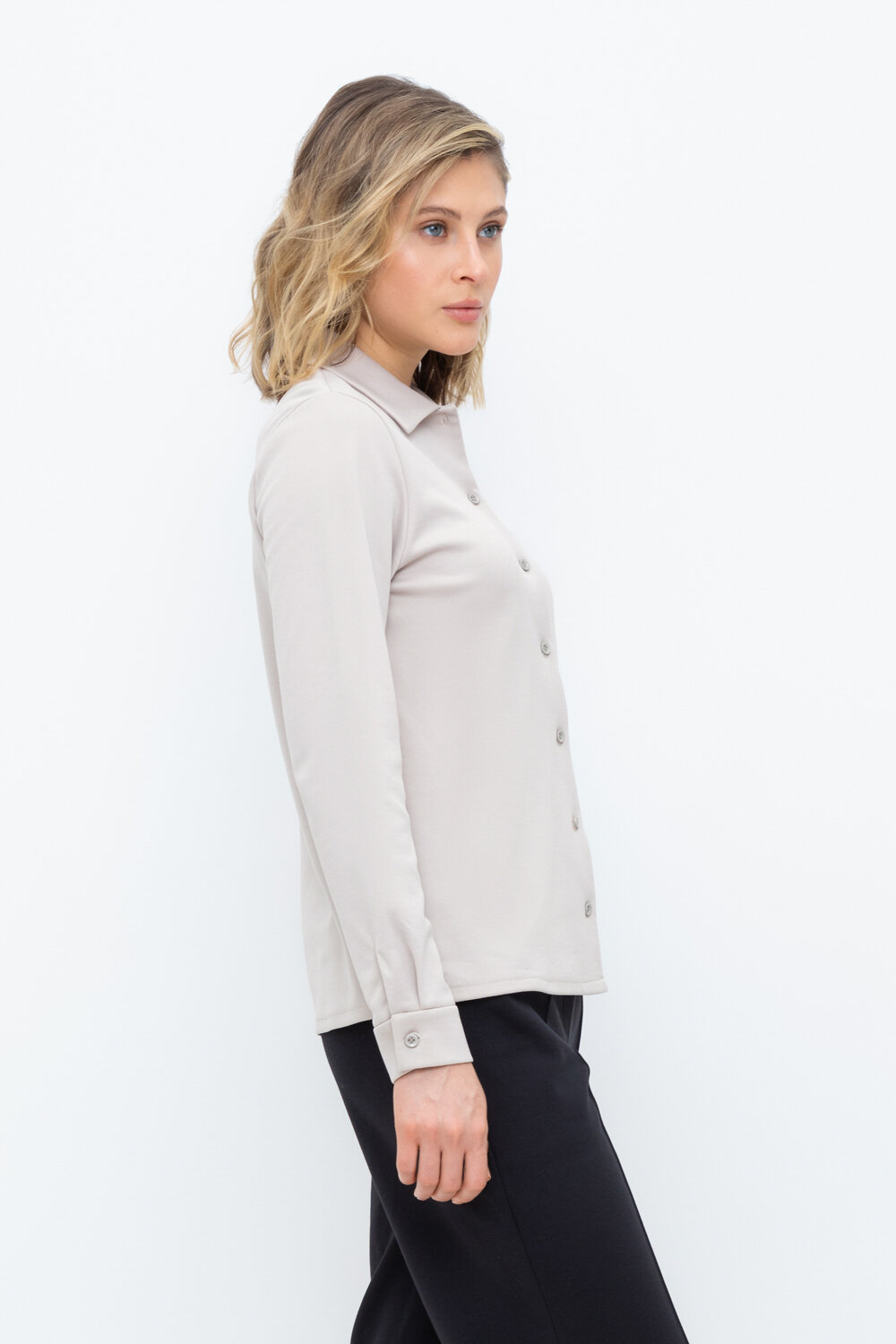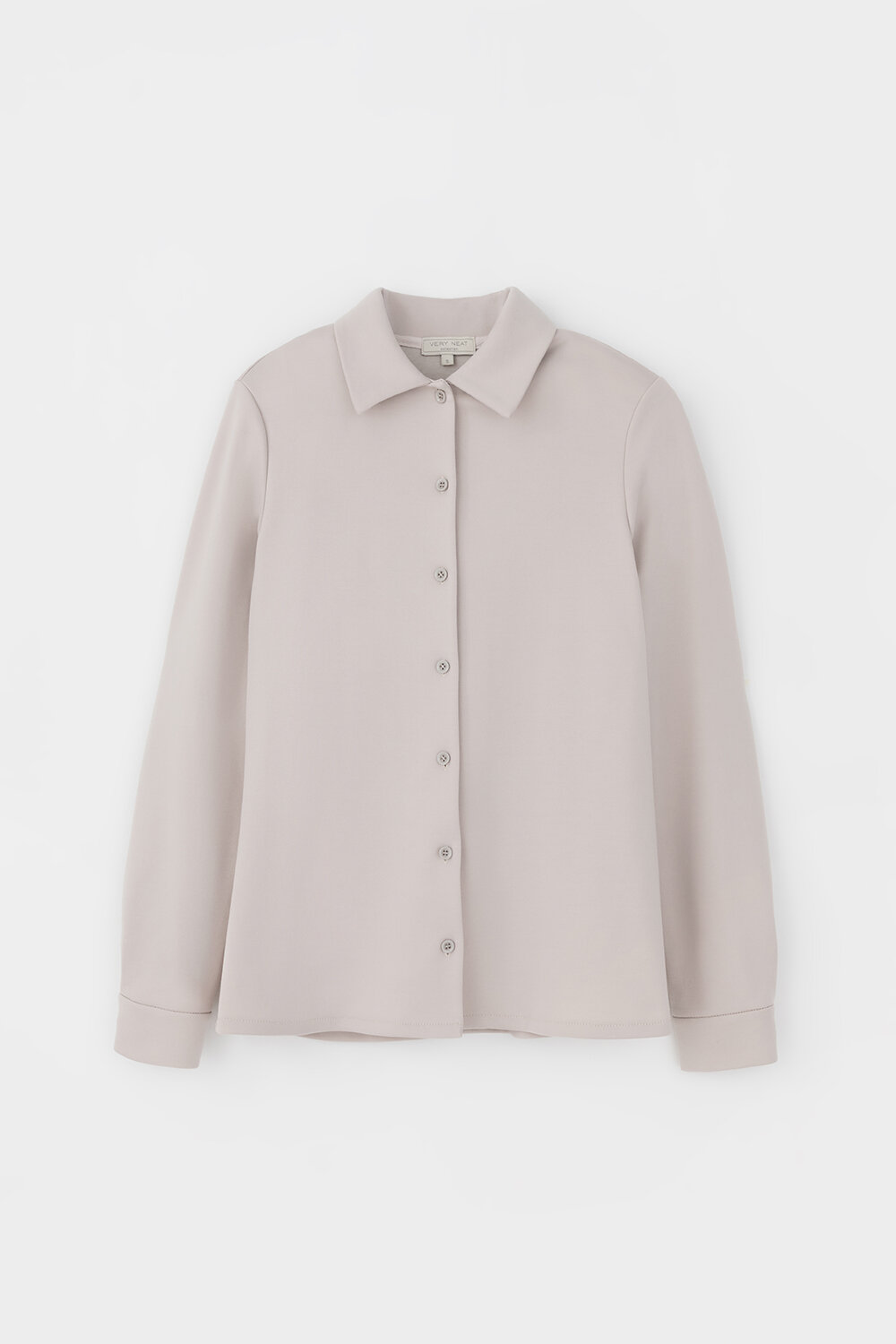 Рубашка прямого кроя из плотного гладкого трикотажа интерлок с длинными рукавами с застежкой на пуговицы.