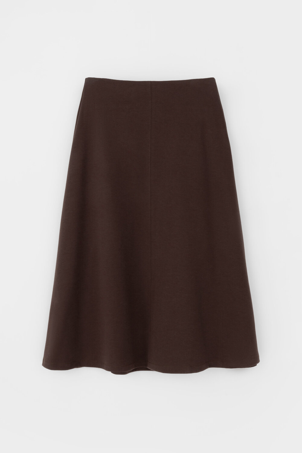 Трикотажная юбка длины миди из плотного гладкого трикотажа интерлок, произведенного из высококачественного гребенного хлопка. В составе 85% натурального хлопка и 15% полиэстера, при этом полиэстер ввязан внутрь по особой технологии и не соприкасается с кожей. Застегивается на потайную молнию. Изделие сохраняет цвет и форму после многократных стирок.
