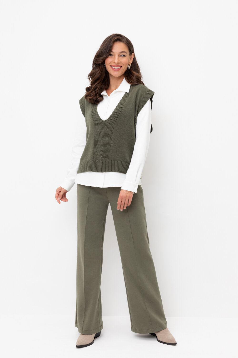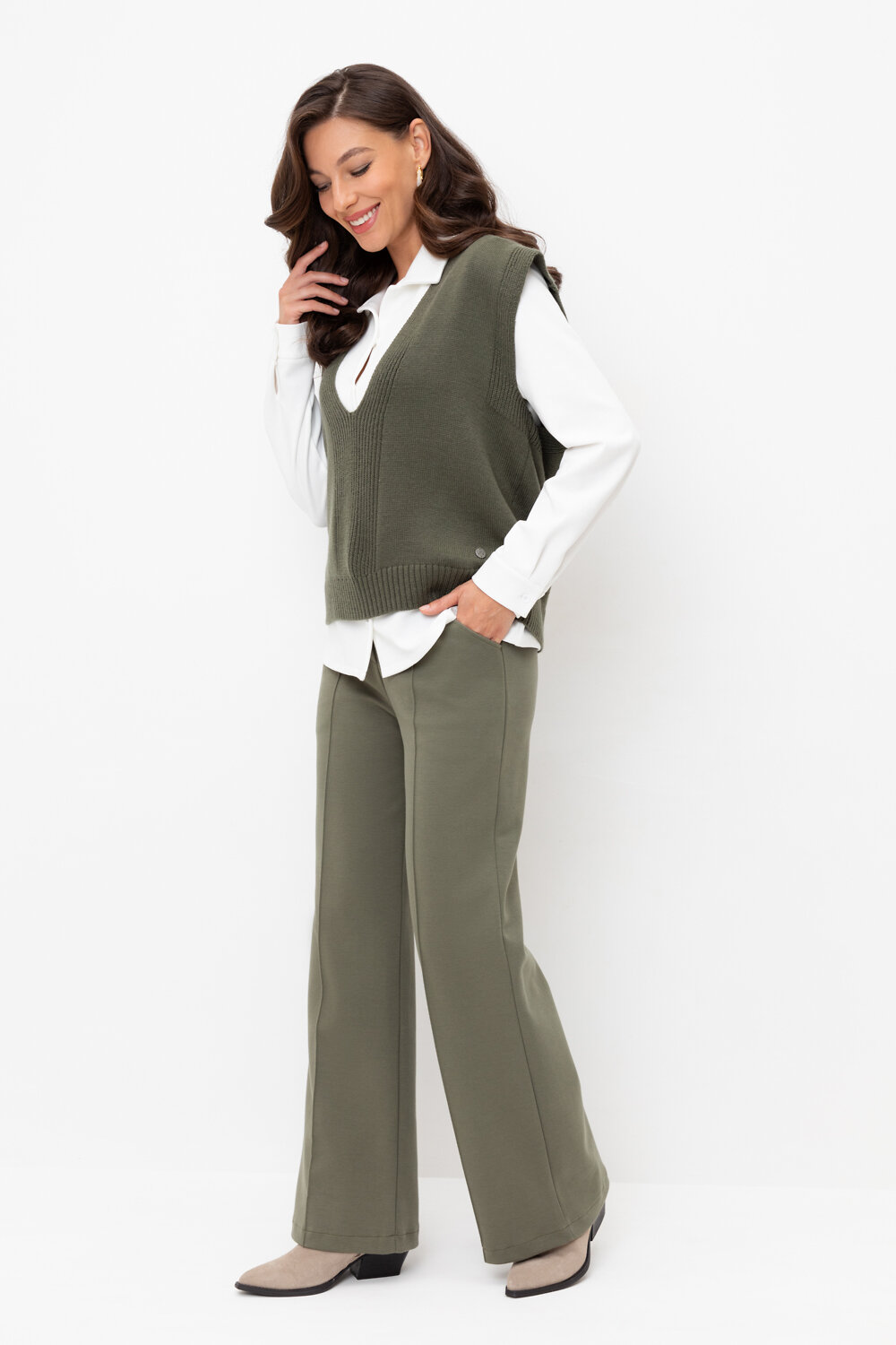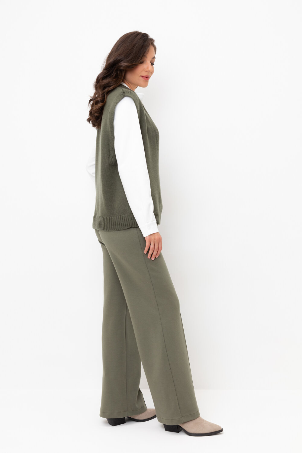 Брюки прямого кроя со стрелкой и боковыми карманами из плотного гладкого трикотажа интерлок. Пояс на резинке обеспечивает комфортную посадку.