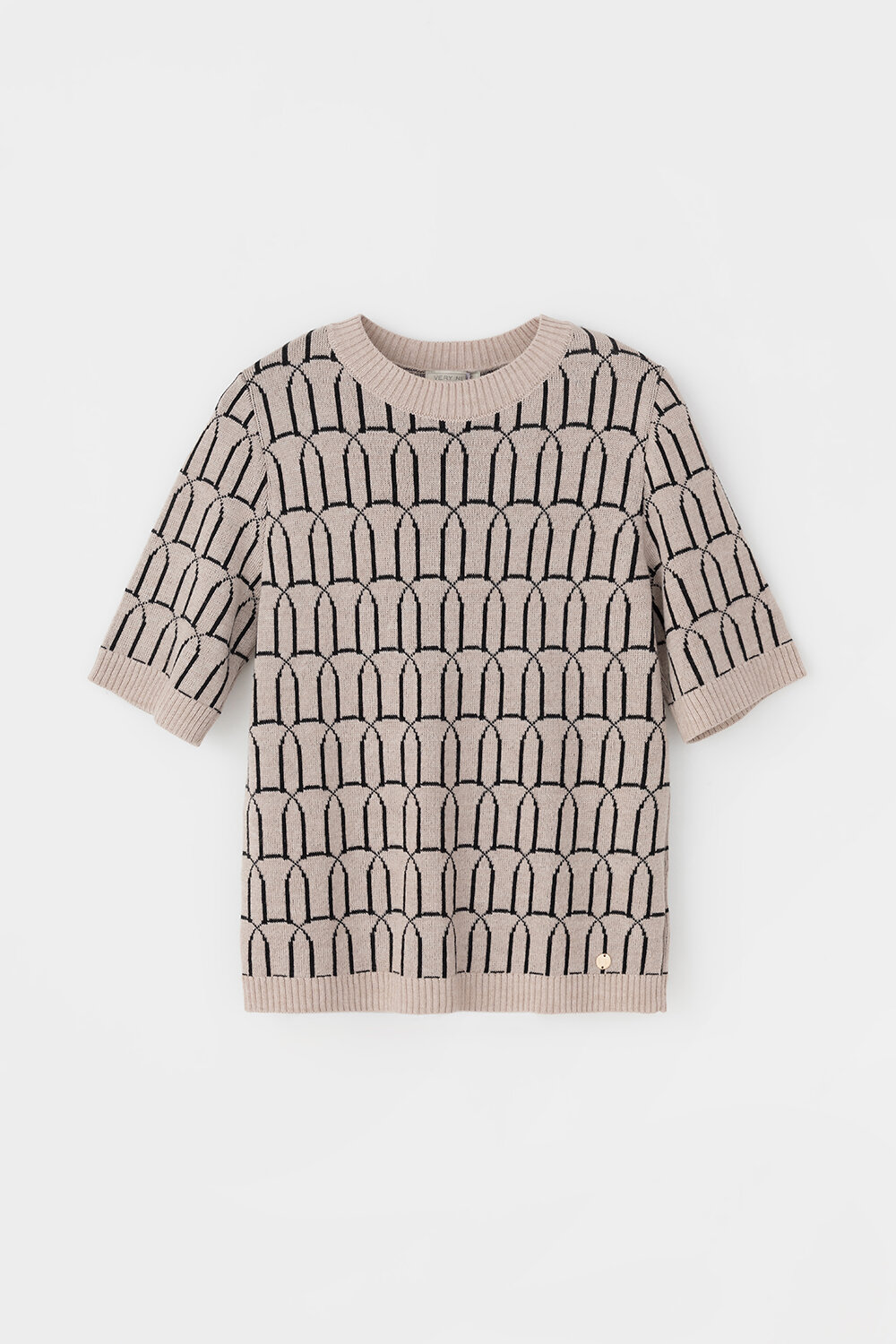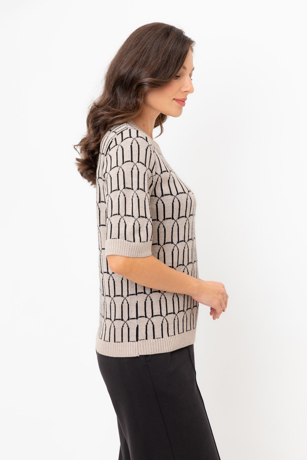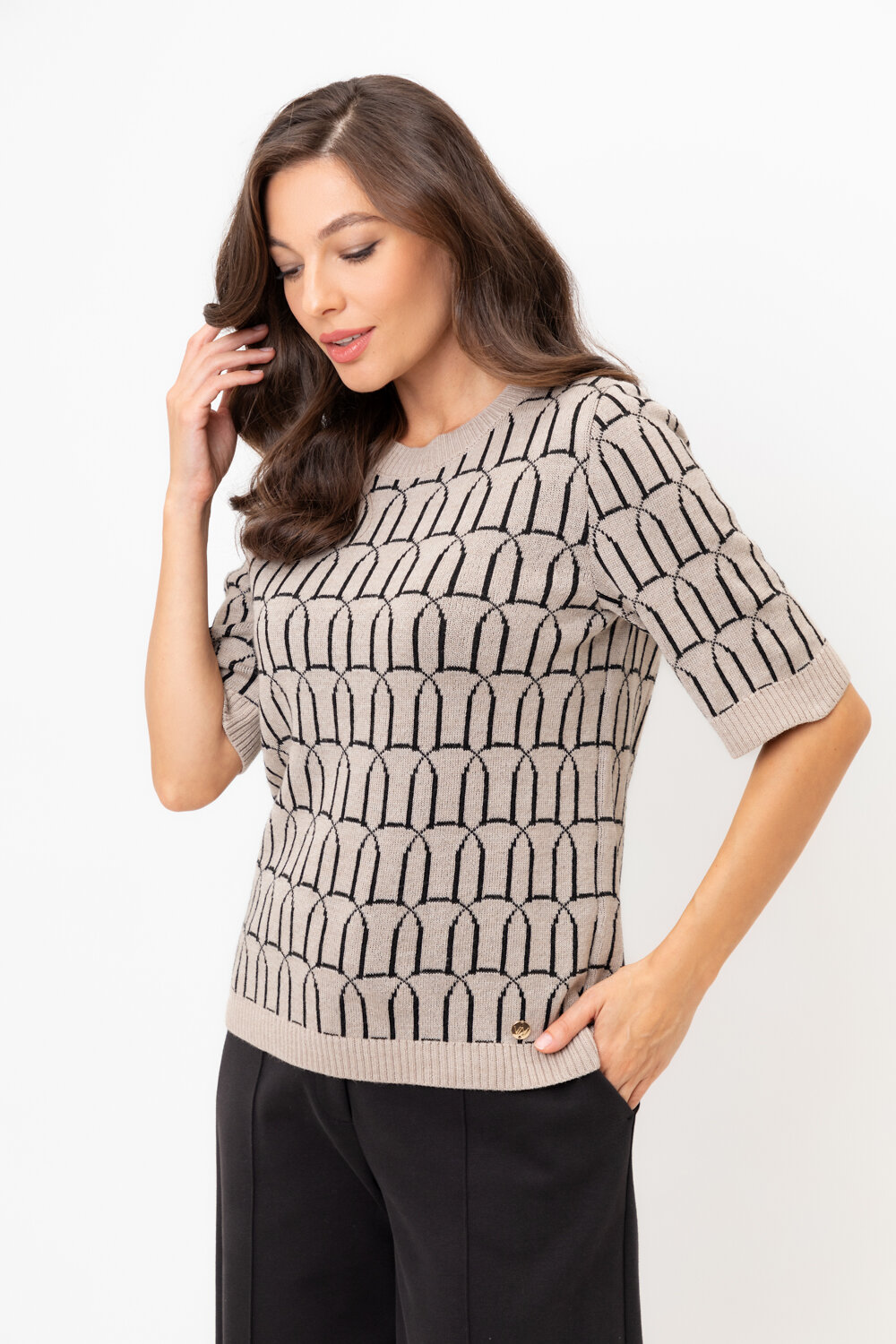 Джемпер в стиле прямой футболки с короткими рукавами. Прямой силуэт, стандартная длина. Средняя плотность вязания, пластичная фактура. Выполнен из мягкой полушерстяной пряжи. Шерсть в составе сохраняет тепло, а благодаря волокнам акрила изделие мягкое и дольше сохраняет форму.