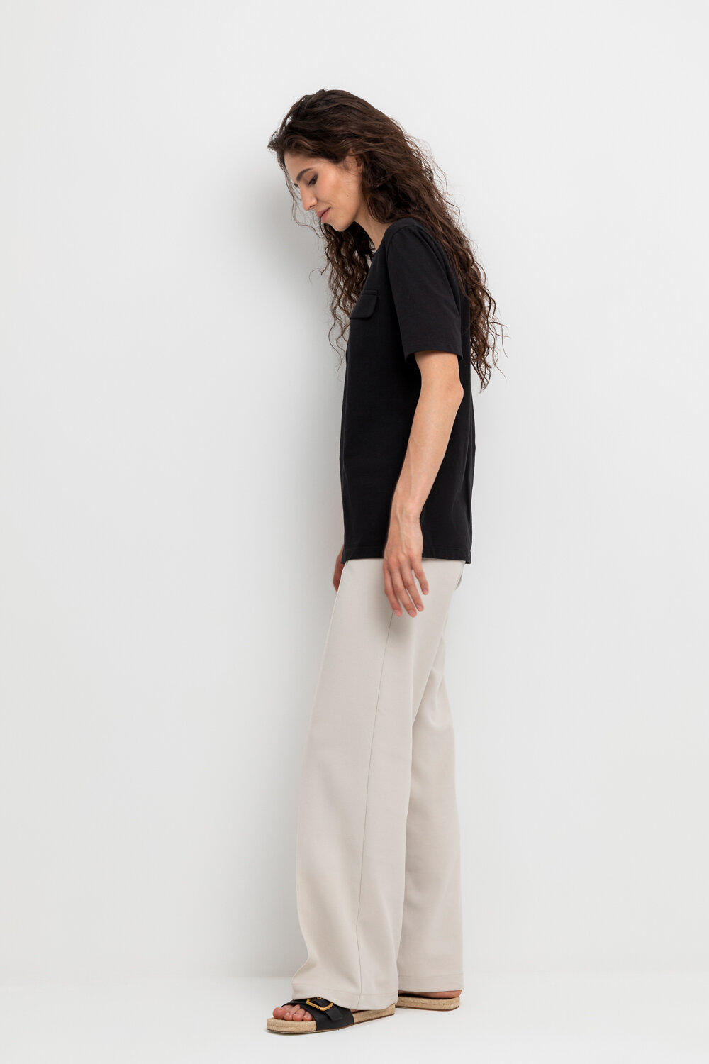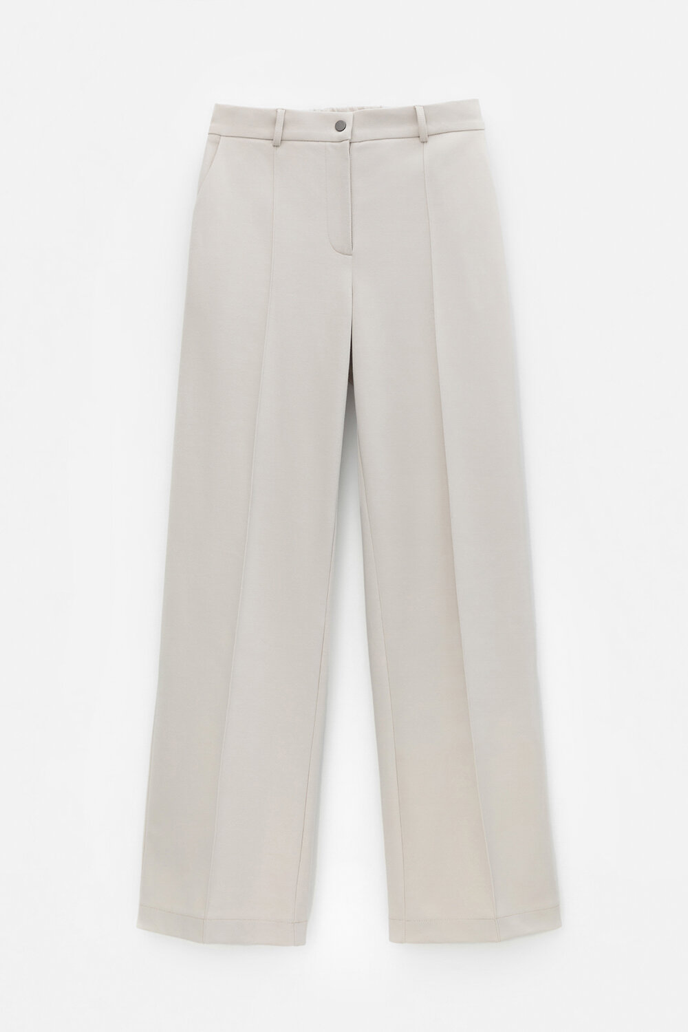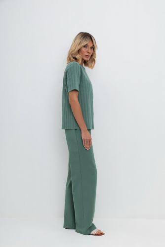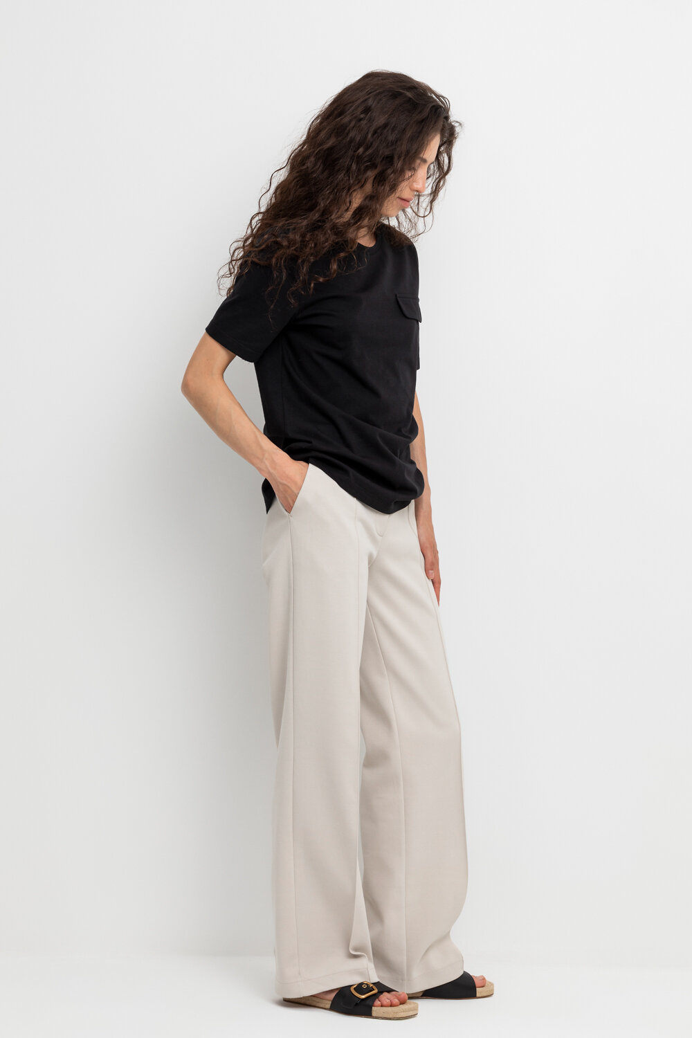 Свободные женские брюки со стрелками и боковыми карманами из плотного гладкого трикотажа интерлок. Застегиваются на молнию и кнопку. Низ обработан плоскими швами.