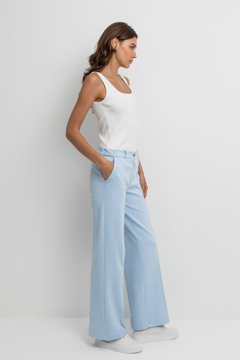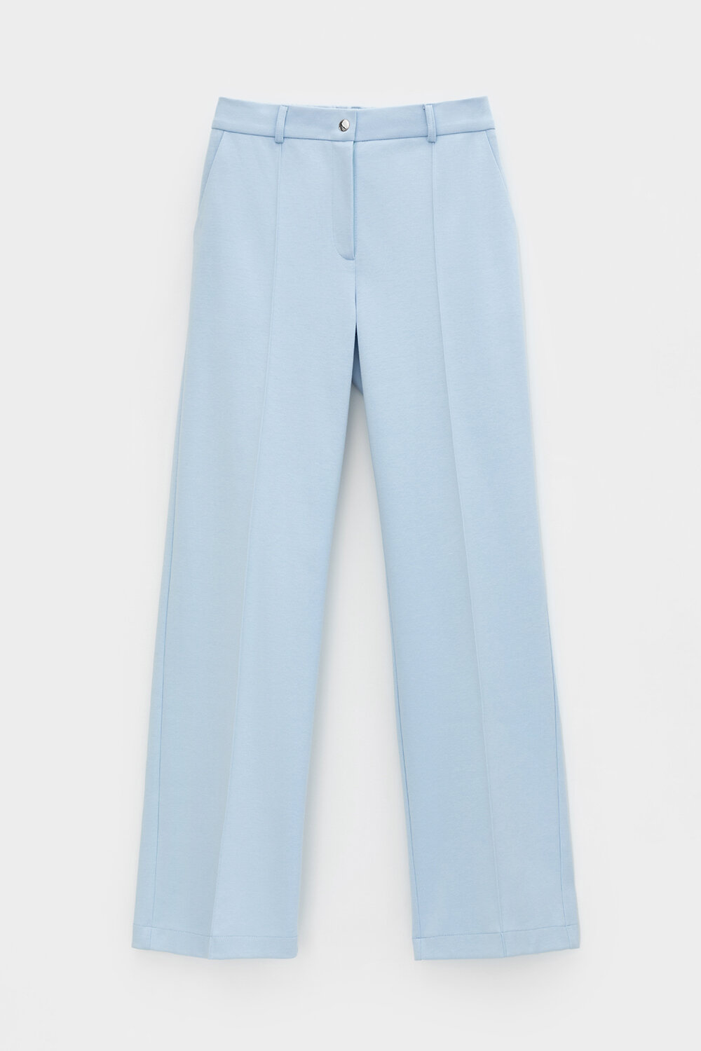 Свободные женские брюки со стрелками и боковыми карманами из плотного гладкого трикотажа интерлок. Застегиваются на молнию и кнопку. Низ обработан плоскими швами.