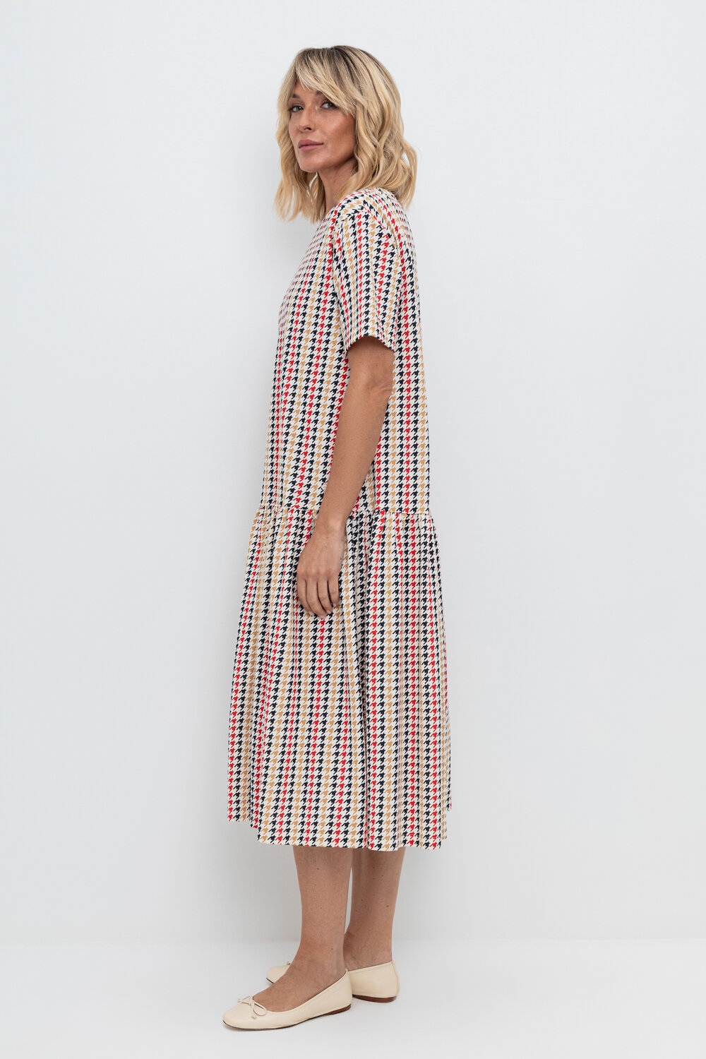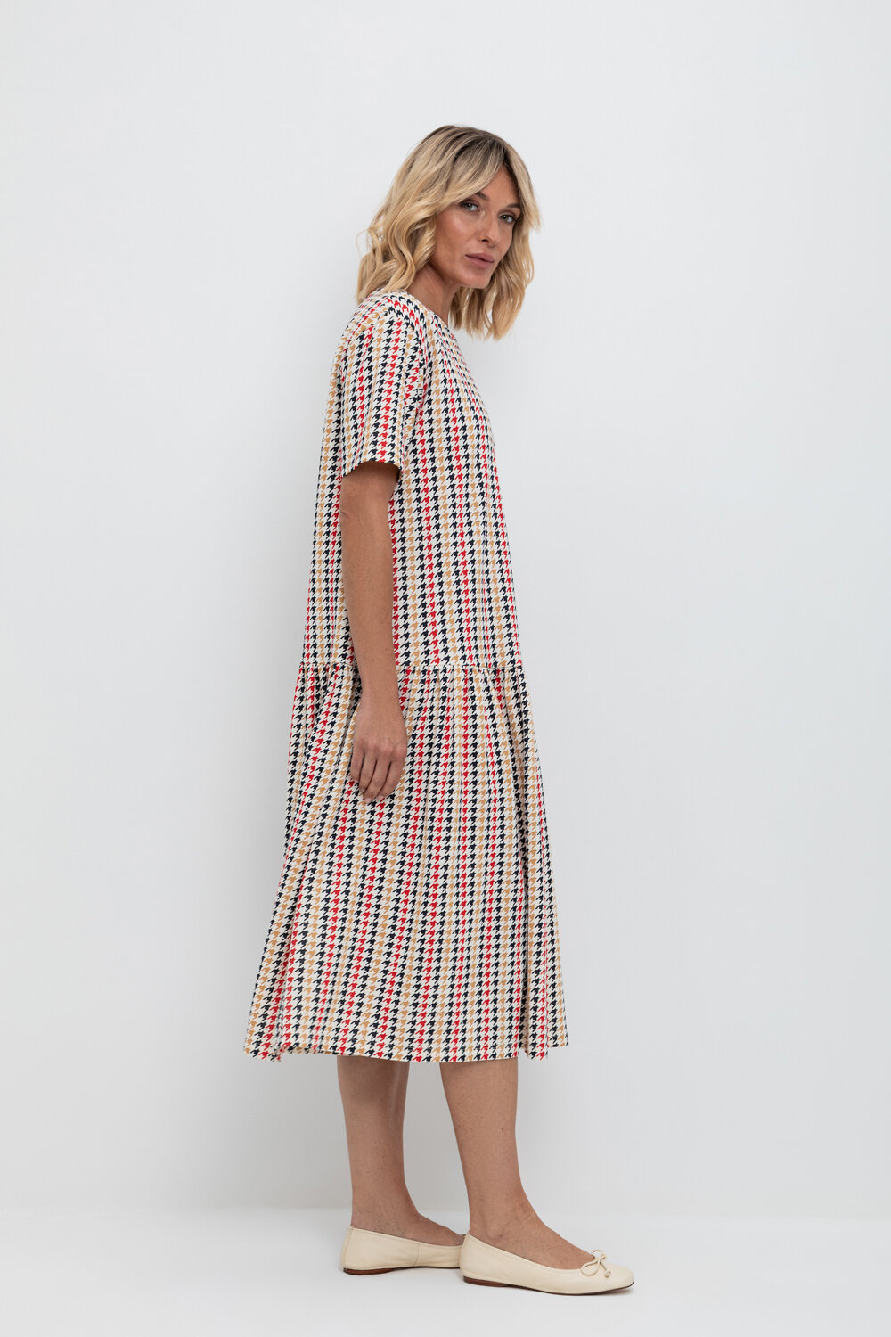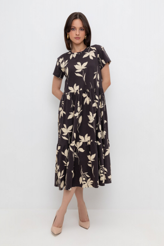 Трикотажное платье с воланом из набивного пике из длинноволокнистого гребенного хлопка. Спущенное плечо придает изделию свободный силуэт.