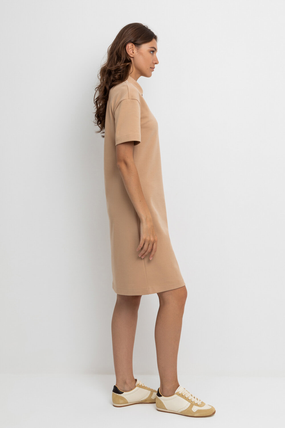 Платье поло с короткими рукавами из плотного гладкого трикотажа интерлок с застежкой на молнию. Спущенное плечо придает изделию свободный силуэт.