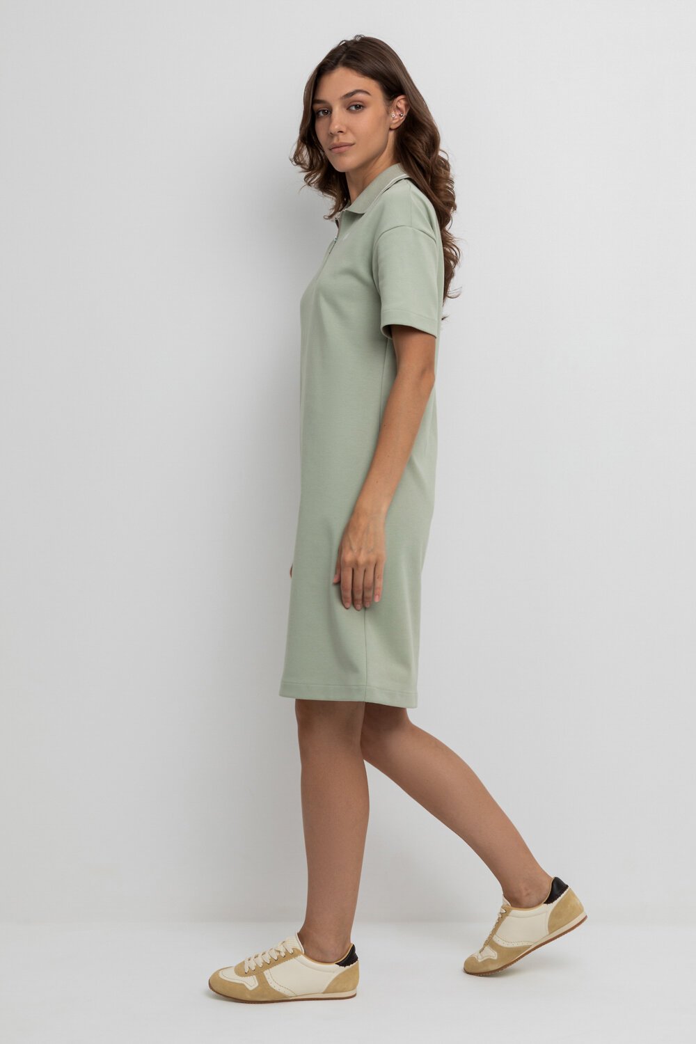 Платье поло с короткими рукавами из плотного гладкого трикотажа интерлок с застежкой на молнию . Спущенное плечо придает изделию свободный силуэт.