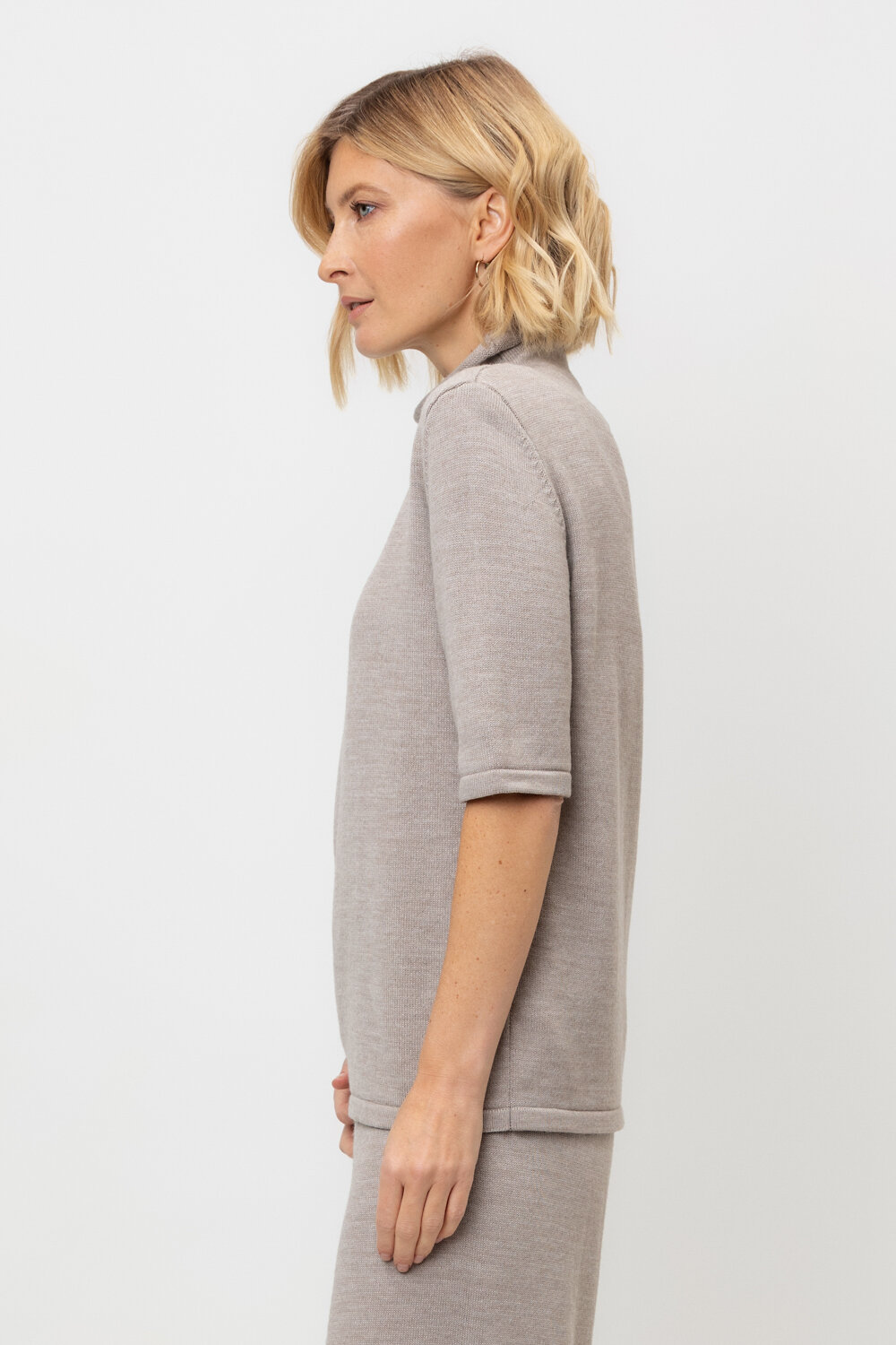 Джемпер в стиле прямой футболки, воротником-стойкой и короткими рукавами. Прямой силуэт, стандартная длина. Средняя плотность вязания, пластичная фактура. Выполнен гладью из мягкой полушерстяной пряжи. Шерсть в составе сохраняет тепло, а благодаря волокнам акрила изделие мягкое и дольше сохраняет форму.