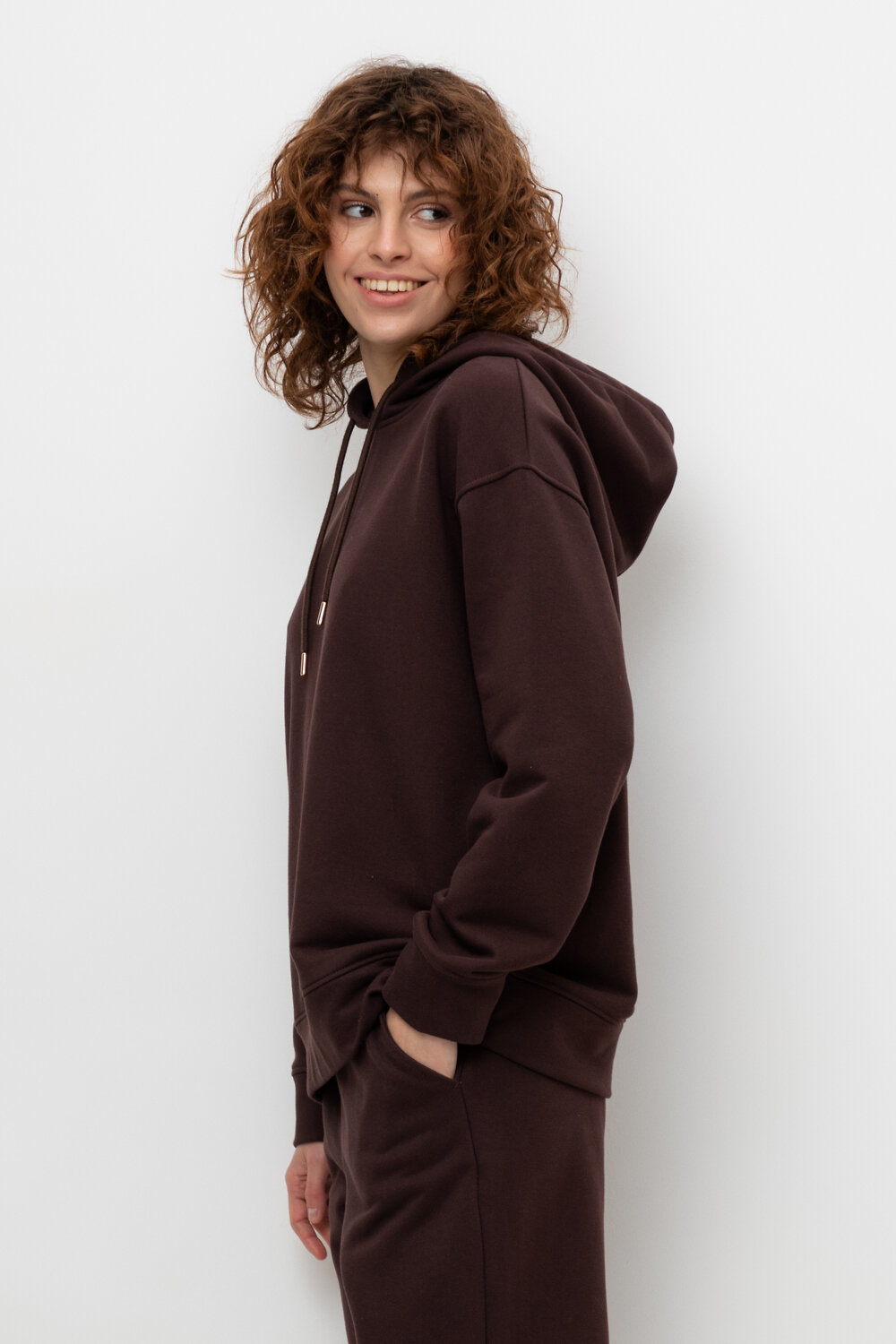 Толстовка с капюшоном и боковыми карманами из петельчатого футера трехнитки. В составе 80% натурального хлопка и 20% полиэстера, при этом полиэстер ввязан внутрь по особой технологии и не соприкасается с кожей. Спущенные рукава, манжеты из основного полотна. Свободный силуэт.